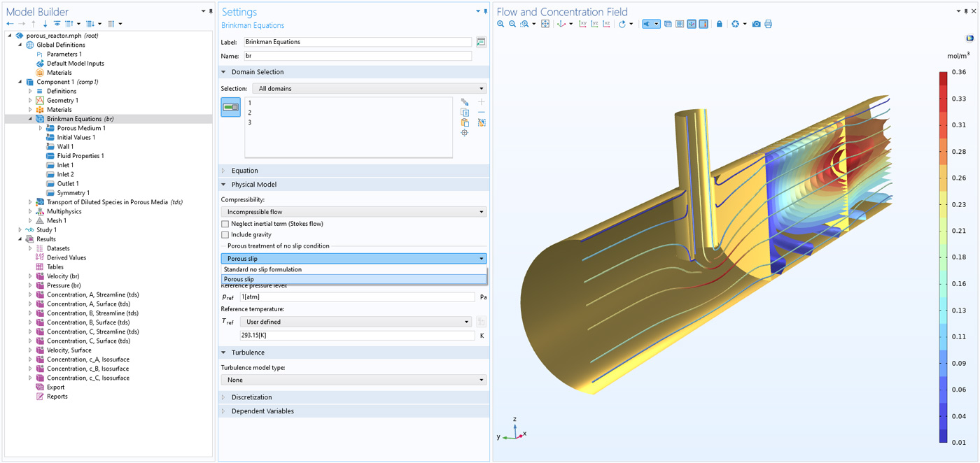 La opción Porous Slip está disponible en la ventana de Ajustes de la interfaz de Ecuaciones de Brinkman