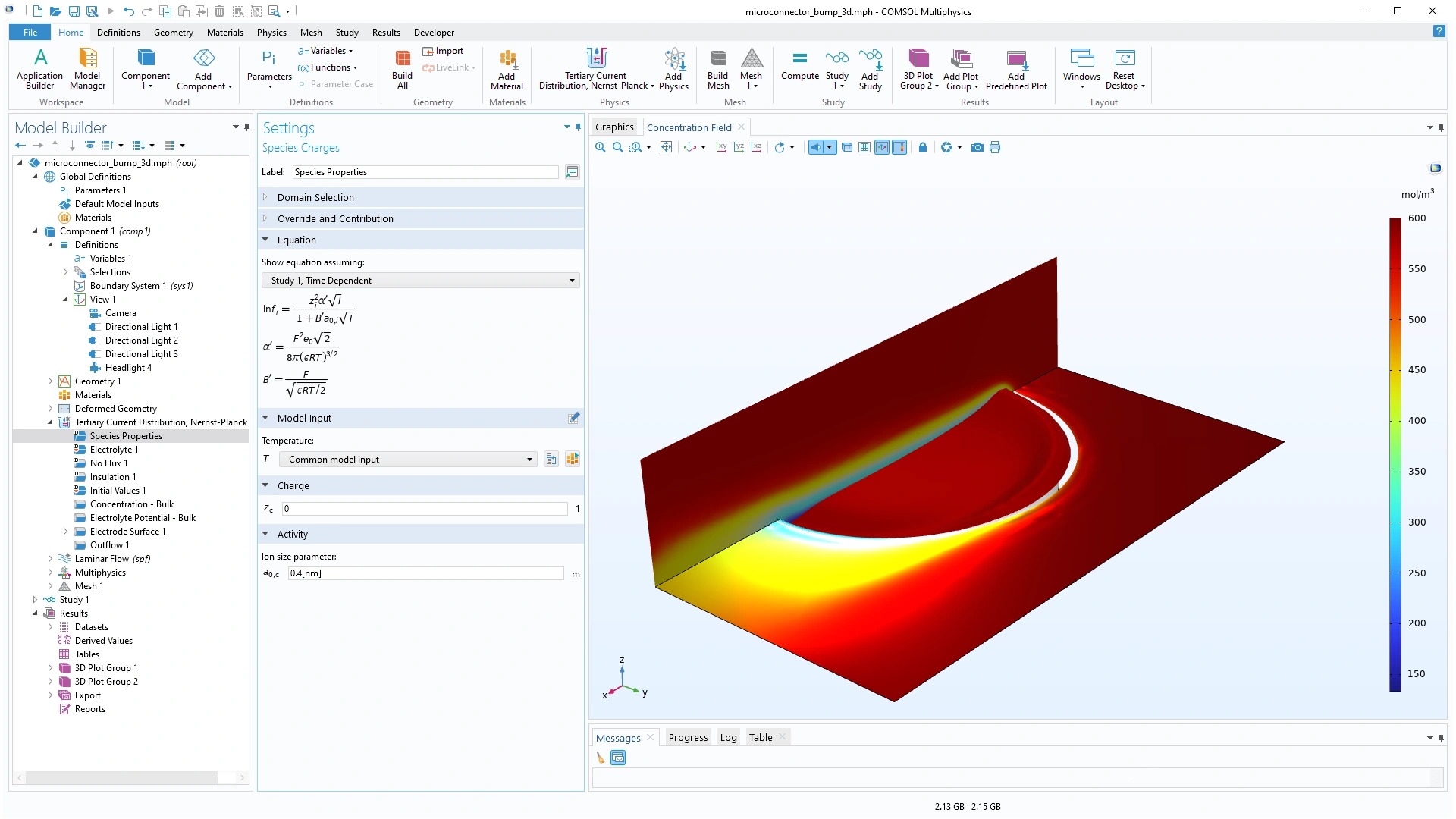 Para modelar electrolitos acuosos con ácidos débiles, bases débiles, anfolitos y especies complejas genéricas, así como para aplicaciones como el modelado de corrosión mecanicista, modelos electroquímicos de sistemas biológicos y el modelado de sensores electroquímicos, una nueva interfaz Aqueous Electrolyte Transport calcula los campos de potencial y concentración de especies en un electrolito acuoso diluido. El transporte se define mediante las ecuaciones de Nernst-Planck, que incorporan difusión, migración y convección, junto con la electroneutralidad y la reacción de equilibrio de autoionización del agua (autoprotólisis). Debido a su gestión más eficiente de las reacciones de las ecuaciones y a su sencilla configuración del modelo, la nueva interfaz puede ser preferible en algunos casos a la interfaz más genérica Tertiary Current Distribution, Nernst–Planck.
