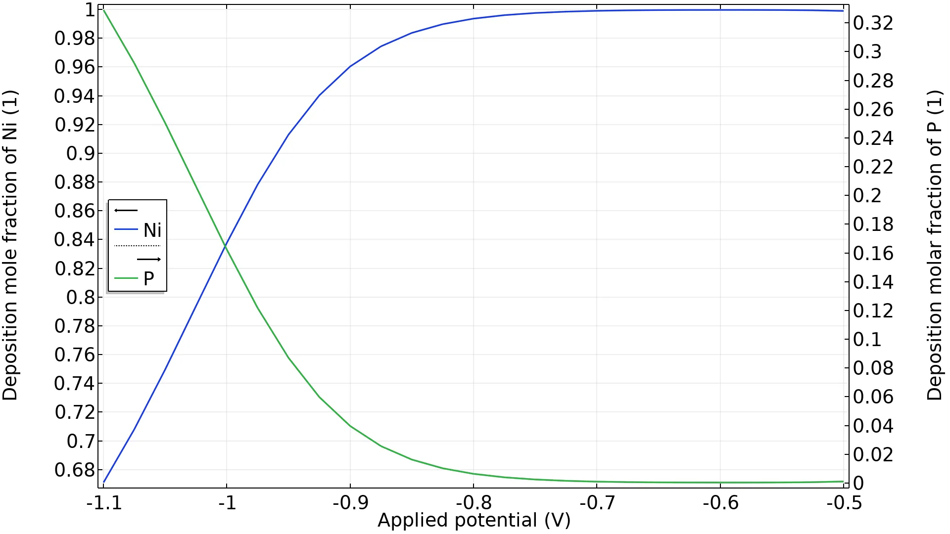 Fracciones molares de deposición de níquel y fósforo a diferentes potenciales aplicados.