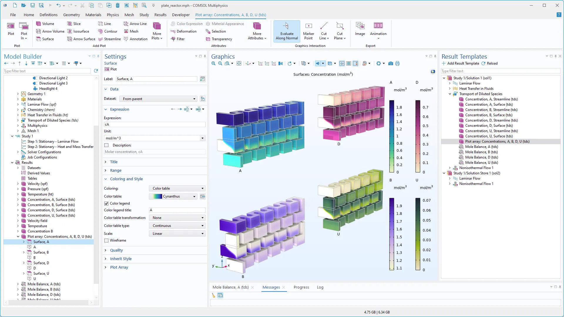 La creación de gráficos útiles y visualmente atractivos de sistemas reactivos puede llevar mucho tiempo, ya que a menudo hay muchos reactivos y, por lo tanto, muchos campos de concentración para representar gráficamente. Para ahorrar tiempo, hay una serie de nuevas plantillas de resultados Result Templates en las interfaces Chemical Species Transport. Entre ellas, ahora hay disponibles plantillas de matriz de gráficos que incluyen hasta cuatro concentraciones de especies simultáneamente en la ventana Graphics. Las plantillas de resultados están disponibles para todas las interfaces de transporte de especies químicas, independientemente del producto complementario, pero son especialmente útiles para las interfaces de transporte multicomponente incluidas en los módulos de ingeniería química, así como en el módulo CFD Module, Porous Media Flow Module, Subsurface Flow Module y Microfluidics Module.