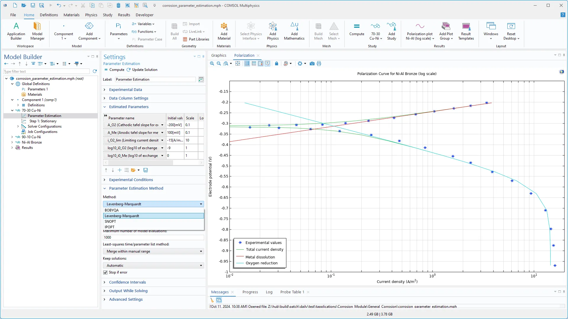 El paso de estudio Parameter Estimation y los resolvedores de optimización BOBYQA, Levenberg–Marquardt y IPOPT ahora están disponibles en el módulo Fuel Cell & Electrolyzer Module. La estimación de parámetros se utiliza para determinar los parámetros del modelo ajustando las simulaciones a los datos experimentales.