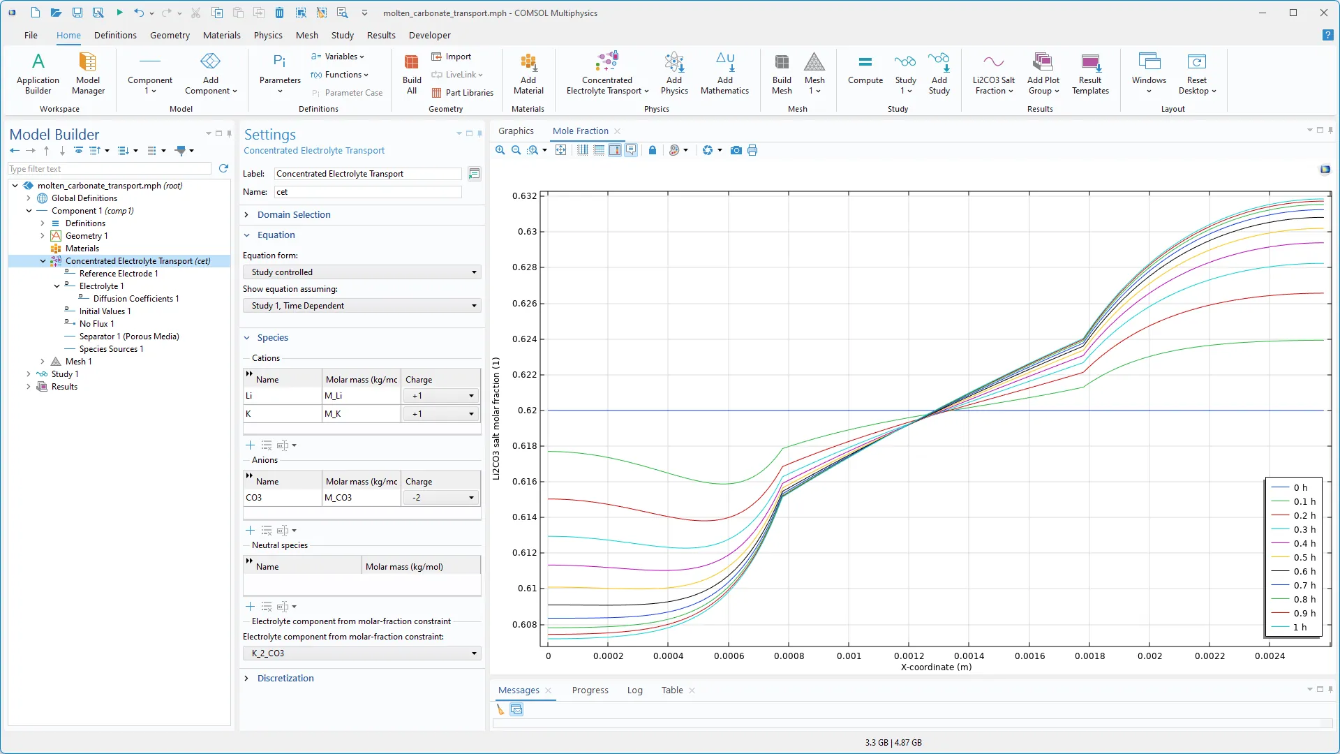 Ahora está disponible una interfaz Concentrated Electrolyte Transport para modelar el transporte en cualquier solución de electrolitos con un número arbitrario de especies cargadas y no cargadas. Esta interfaz electroquímica se basa en la teoría de soluciones concentradas, donde las ecuaciones de transporte se definen utilizando coeficientes de difusión binarios de Maxwell-Stefan asumiendo electroneutralidad local. A diferencia de las ecuaciones de Nernst-Planck, la teoría de soluciones concentradas no supone que las especies de electrolitos se diluyan en un disolvente neutro de concentración constante. Los electrolitos típicos que se pueden modelar incluyen líquidos iónicos, sales fundidas y soluciones altamente concentradas que presentan gradientes de concentración no despreciables de las especies portadoras de carga. El nuevo modelo tutorial Molten Carbonate Transport muestra esta funcionalidad.