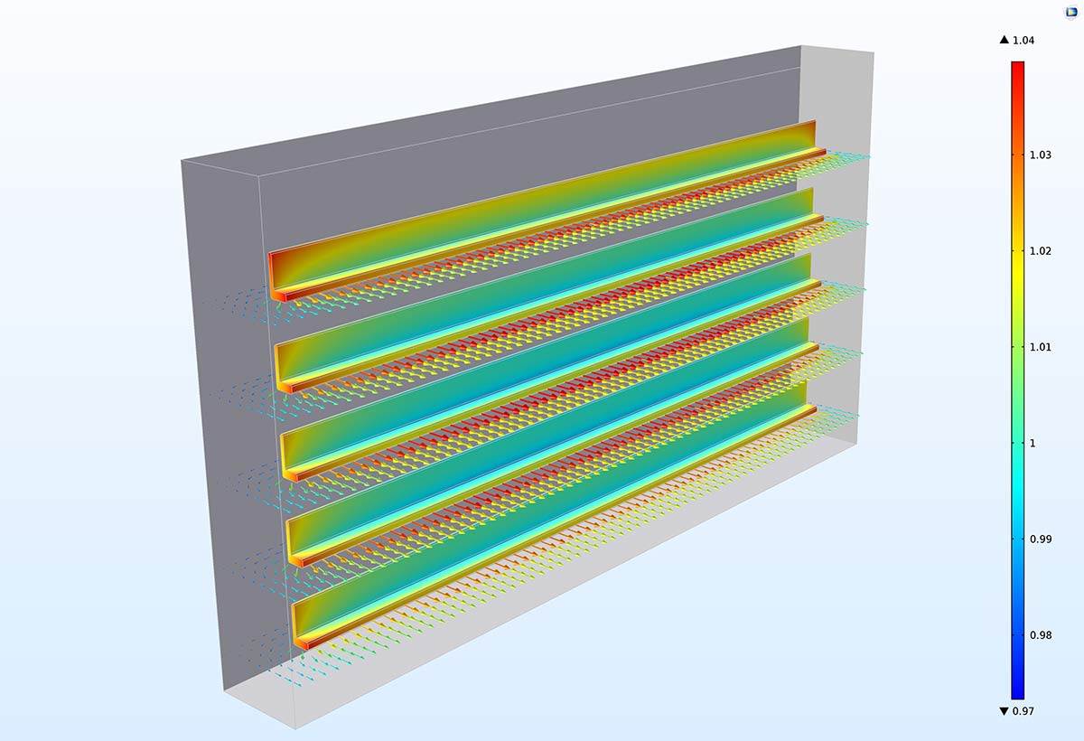 Con la nueva versión de la interfaz Flujo en medio libre y poroso se puede acoplar flujo laminar o libre turbulento con flujo en medios porosos. Esta interfaz sigue siendo única en su acoplamiento con las interfaces electroquímicas para el modelado de electrodos porosos.
