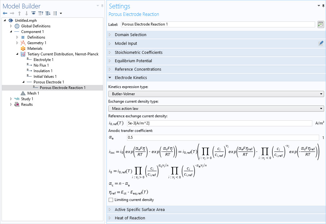 En la funcionalidades Electrode Reaction y Porous Electrode Reaction, la densidad de corriente de intercambio de las expresiones de cinéticas Butler-Volmer y Linearized Butler-Volmer ahora pueden ser automáticamente definidas para ser dependientes de la concentración, basándose en la estequiometría de la reacción. La opción está disponible si la opción Nernst equation es utilizada para definir el potencial de equilibrio. En la interfaz Tertiary Current Distribution, Nernst-Planck, las opciones Mass action law y Lumped multistep están disponibles para el tipo de densidad de corriente de intercambio. Se han actualizado todos los modelos de la Librería de Aplicaciones que disponen de potenciales de equilibrio Nernstiano, para que usen la nueva funcionalidad.