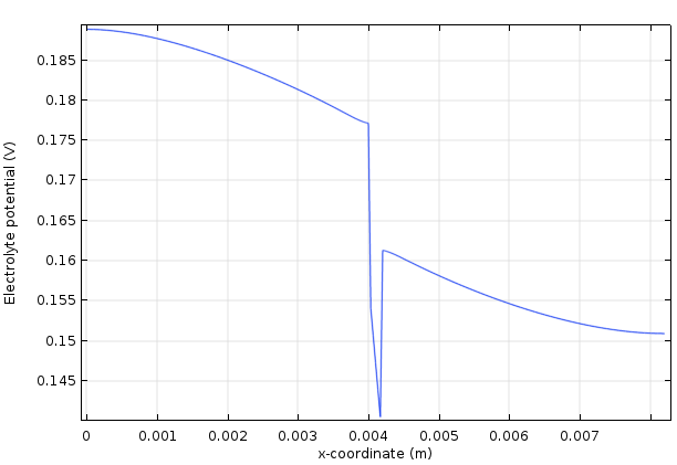 Potencial del electrolito en una batería de flujo redox de vanadio mostrando los cambios de potencial en las interfaces entre el electrolito libre y la membrana de intercambio de iones.