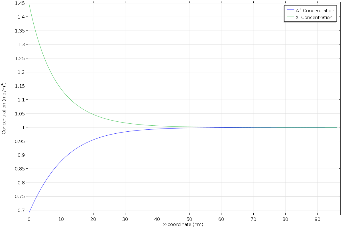 Para garantizar la electroneutralidad y el cumplimiento de los equilibrios de Donnan, la función Ion-Exchange Membrane de la interfaz Tertiary Current Distribution, Nernst–Planck ahora incluye la opción Add Donnan shift to initial values. Esta opción desplaza automáticamente los valores iniciales de concentración y potencial especificados en la función Initial Values para el nodo activo del dominio Ion-Exchange Membrane, asumiendo que los valores definidos por el usuario representan los valores de un electrolito líquido en equilibrio con la membrana. Los valores iniciales desplazados se utilizan como valores iniciales para el solucionador. Activar esta opción suele simplificar la configuración del modelo, ya que elimina la necesidad de barrer la carga espacial fija de la membrana a un valor deseado distinto de cero mediante un paso de estudio adicional.