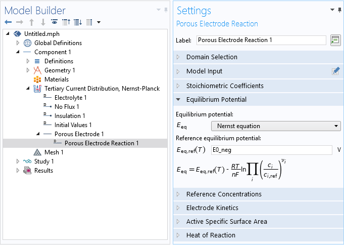 Las reacciones de electrodo ahora soportan un nuevo tipo de cinético de electrodo de Equilibrio termodinámico (conocido como Condición primaria en la interfaz de Distribución de corriente secundaria), que considera un sobrepotencial cero (pérdidas de tensión despreciables).