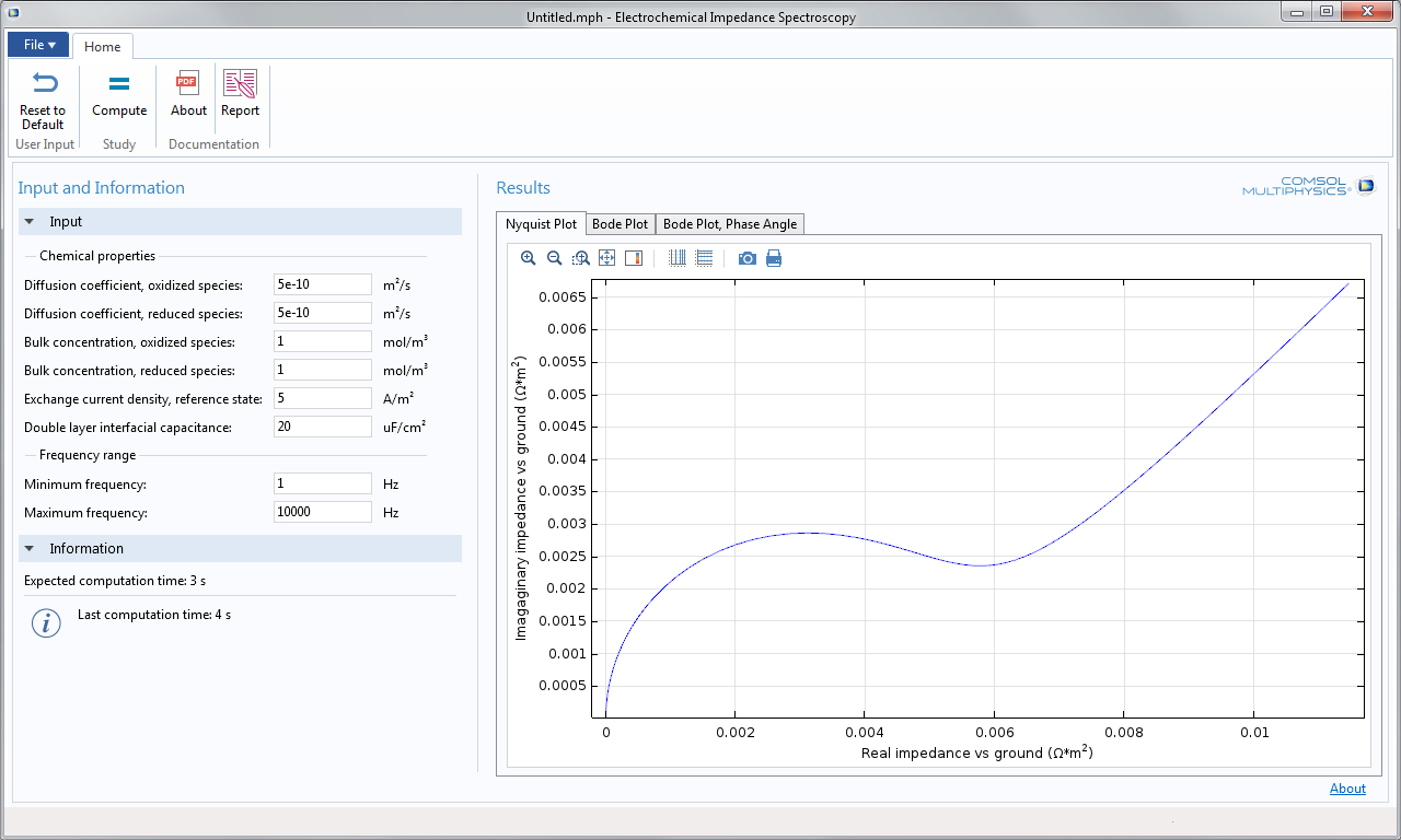 El objetivo de la app de análisis Electrochemical Impedance Spectroscopy es comprender los gráficos de Nyquist y Bode de la EIS. La app permite variar la concentración de volumen, el coeficiente de difusión, la densidad de carga de intercambio, la capacidad de doble capa y las frecuencias mínima y máxima.