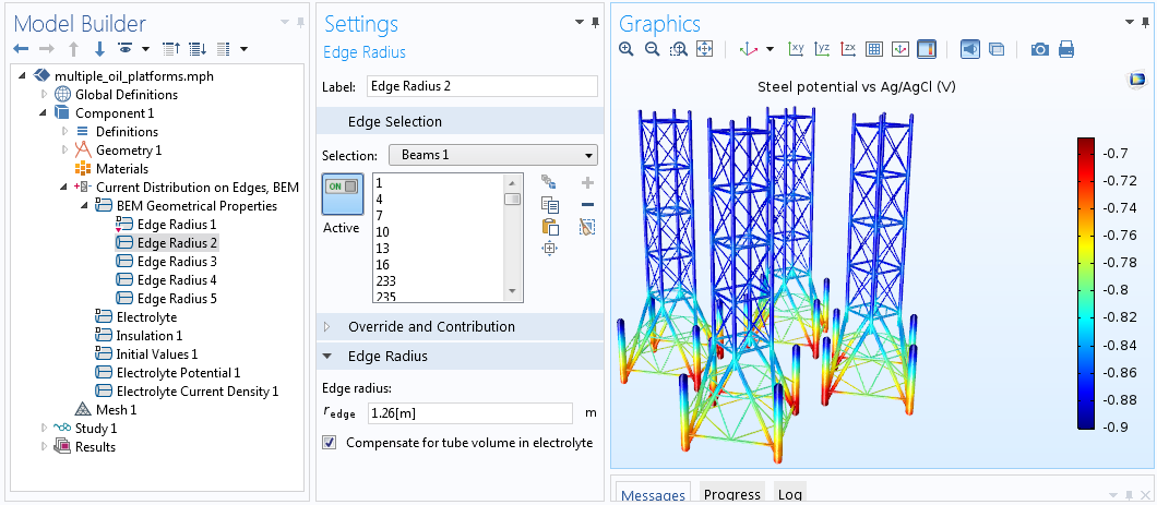 La interfaz Distribución de corriente, Elementos de contorno puede utilizarse para resolver problemas de distribución de corriente primaria y secundaria en geometrías basadas en aristas (viga o cable) y elementos de superficie. La interfaz utiliza una formulación del método de elementos de contorno (BEM) para resolver la ecuación de transferencia de carga en un electrolito de conductividad constante, donde los electrodos se especifican en contornos o como tubos con un radio dado alrededor de las aristas. Normalmente se usa esta interfaz para reducir el mallado y el tiempo de resolvedor para grandes geometrías, donde una parte significativa de la geometría puede aproximarse mediante tubos a lo largo de aristas.