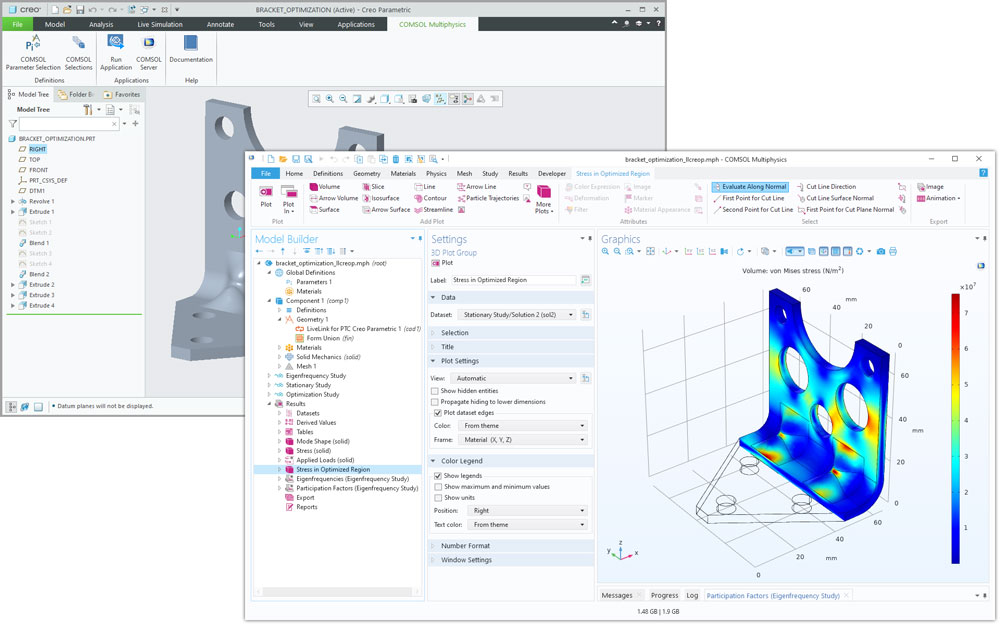 La interfaz de usuario de PTC® Creo® Parametric™ que muestra la geometría original y la interfaz de usuario de COMSOL Multiphysics® que muestra el soporte optimizado.