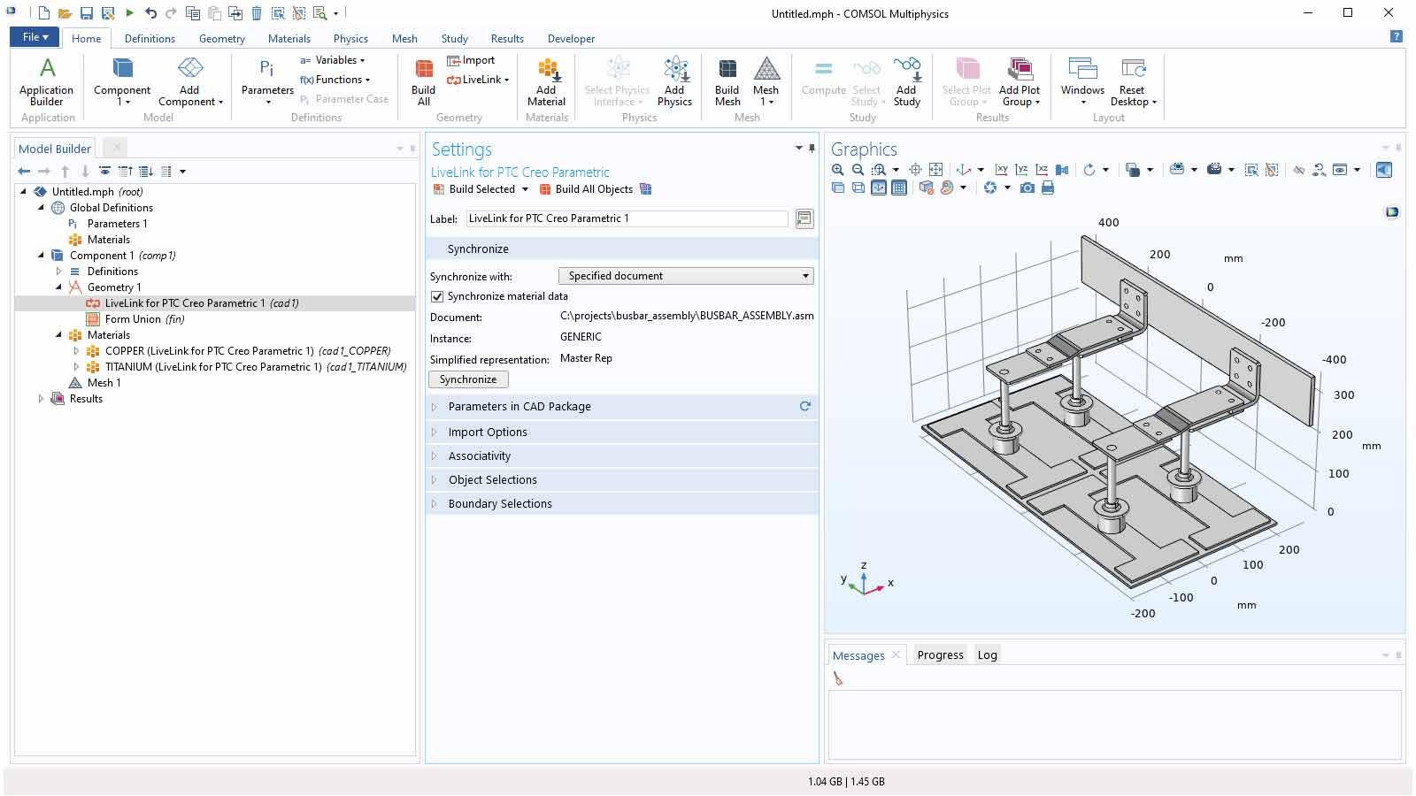 Los nodos de material Titanium y Copper se generan durante la sincronización cuando se selecciona la nueva casilla Synchronize material en los ajustes para LiveLink™ for PTC® Creo® Parametric™.