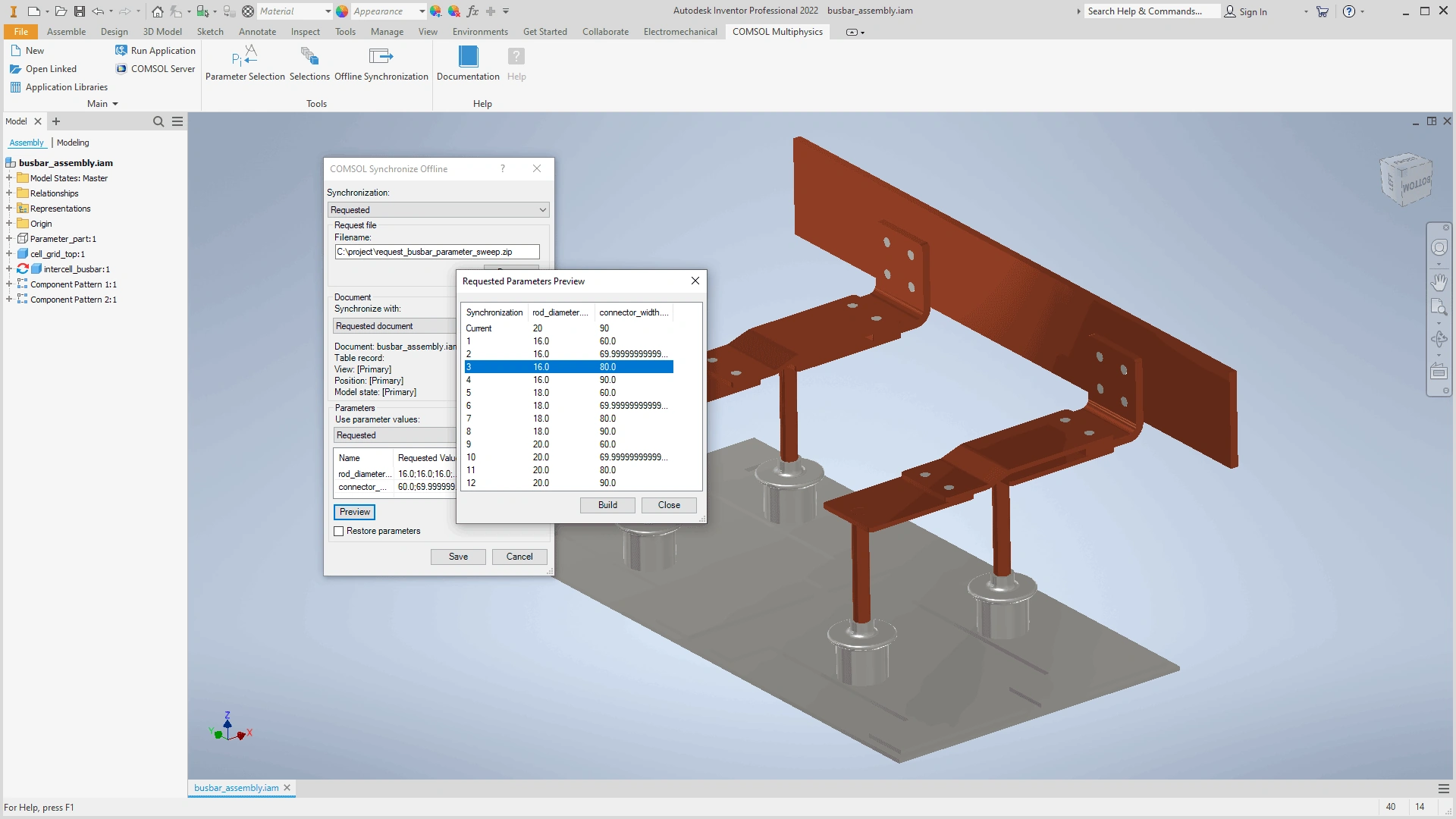 Con la versión 6.1 de LiveLink™ for Inventor®, la ventana Synchronize Offline en la interfaz de usuario del software CAD ahora incluye un botón para obtener una vista previa de la geometría para las combinaciones de parámetros en el archivo de solicitud de sincronización. Esta funcionalidad ofrece un botón Build, que calcula automáticamente el diseño para el valor del parámetro seleccionado. Puede utilizarse este botón para ver cada diseño y comprobar que las geometrías válidas se guardan en el archivo de sincronización.