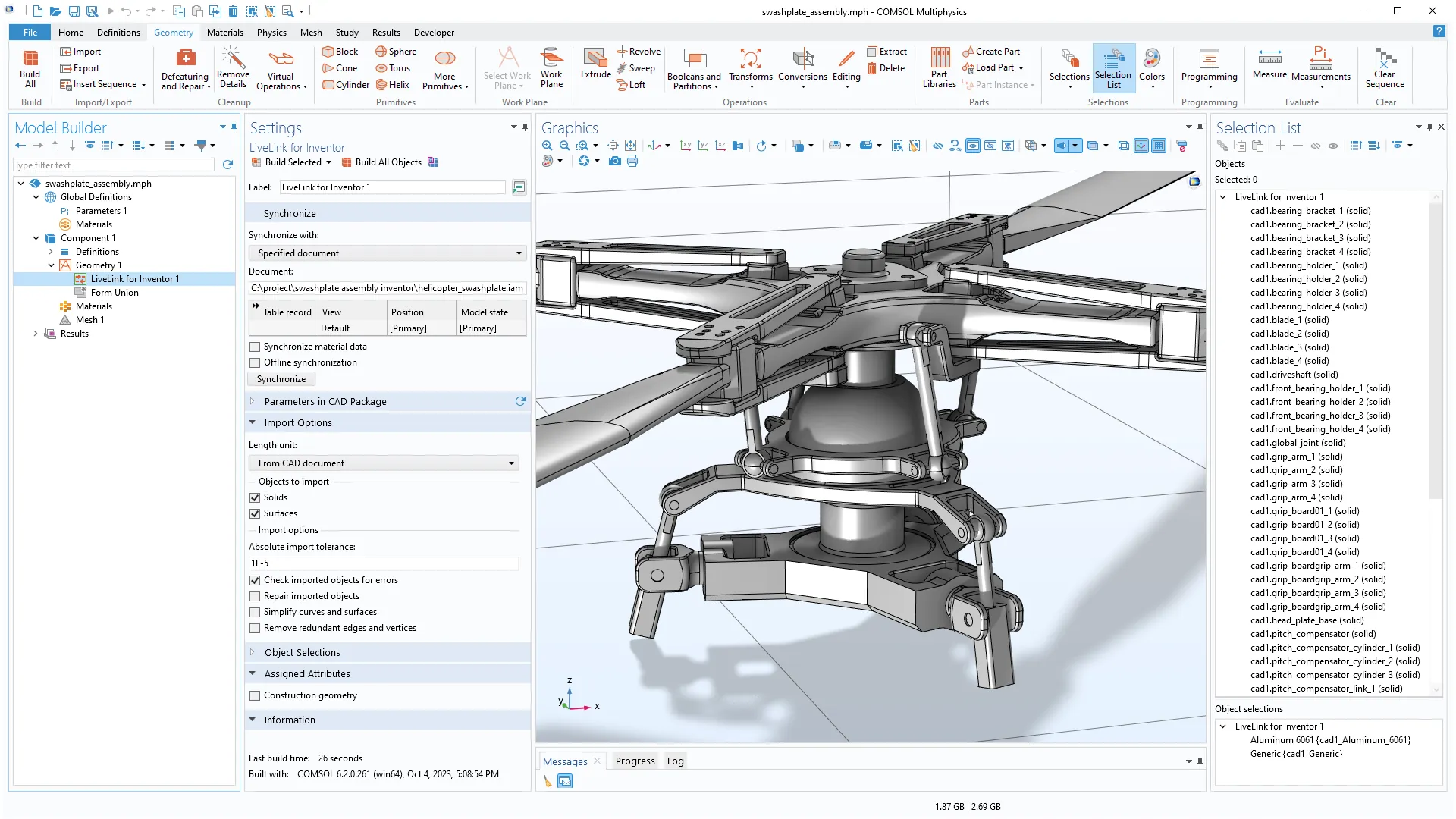 La geometría sincronizada del diseño de un plato cíclico de helicóptero. Los componentes del ensamblaje CAD de Inventor® son reconocibles en los nombres de los objetos que se muestran en la ventana Selection List en el lado derecho de la interfaz de usuario.