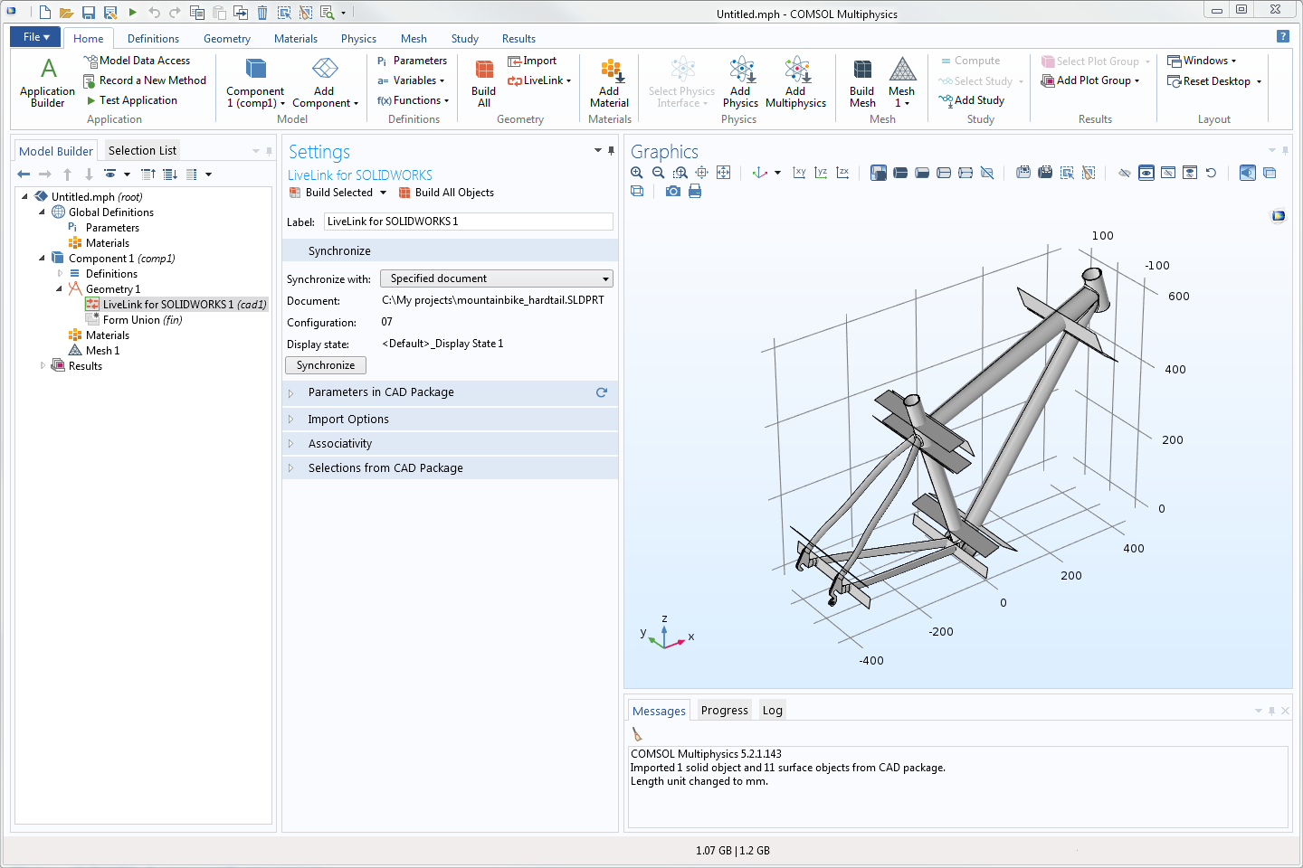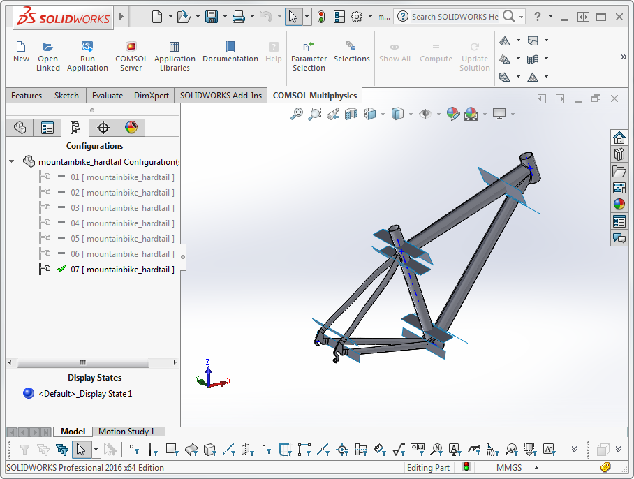 Este diseño de bicicleta en SOLIDWORKS® tiene varias configuraciones y un estado de visualización. Después de la sincronización, se muestran la configuración y el estado de visualización en la ventana de Ajustes para el nodo de LiveLink™ for SOLIDWORKS®. Durante futuras actualizaciones, la interfaz se sincronizará automáticamente con la primera configuración sincronizada, incluso si otra configuración esá activa en SOLIDWORKS®.