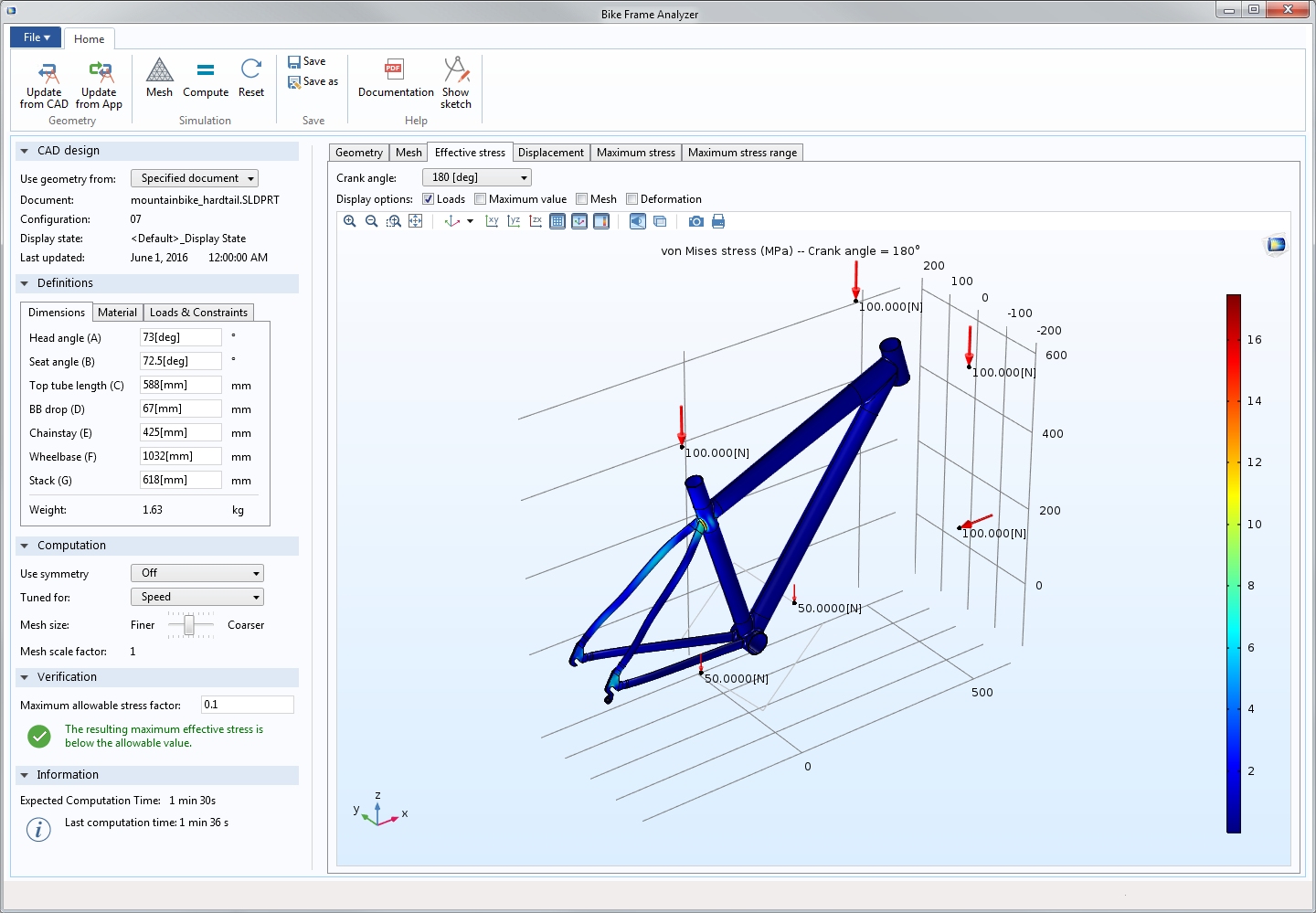 Para mantener fácilmente el seguimiento del diseño CAD analizado cuando la geometría en la app se actualiza desde un documento de SOLIDWORKS®, la app muestra la información del archivo CAD, como la fecha y hora de la última actualización, así como el nombre del documento, su configuración y el estado de visualización. Se pueden manipular las dimensiones de la geometría del cuadro, como el ángulo de cabeza, el ángulo del asiento, la longitud del tubo superior, caida de la base, etc. También se pueden definir las propiedades del material para que sea aluminio, acero, titanio o alguno especificado por el usuario. También se pueden especificar los casos de cargas y restricciones.