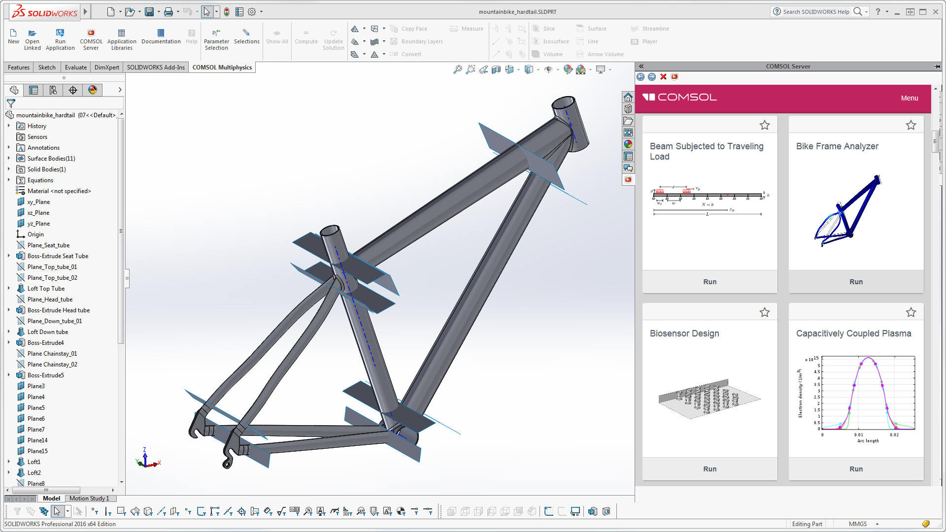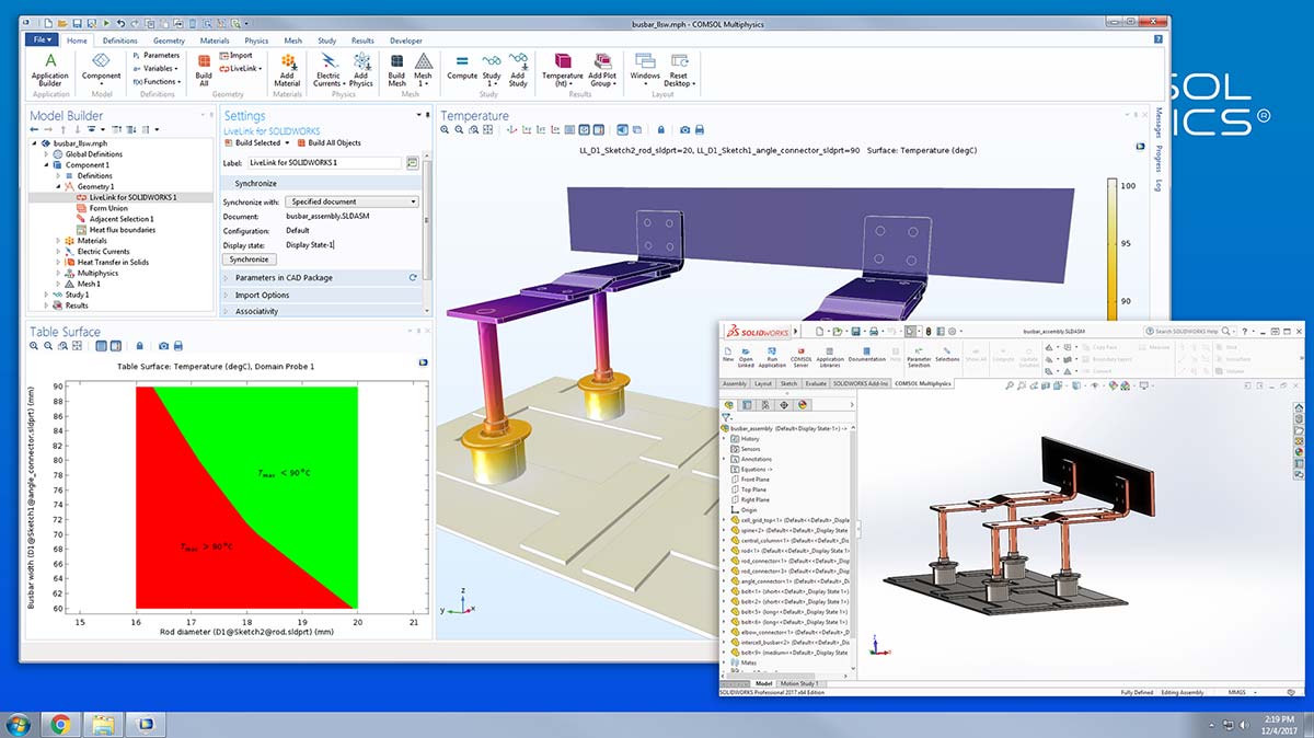 Ahora se pueden construir apps con Application Builder y utilizar funcionalidades de LiveLink™ for SOLIDWORKS®. Esto permitirá a los ingenieros que han creado modelos utilizando SOLIDWORKS® importar y manipular sus geometrías CAD, dentro de la app, y entonces sincronizar sus apps con el entorno de modelado de SOLIDWORKS®. Para correr estas apps en COMSOL Server™ el usuario necesitará utilizar COMSOL® Client for Windows®.