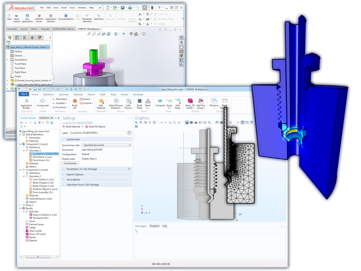 LiveLink™ for SOLIDWORKS® proporciona una integración completa entre el CAD y la simulación. Establece una conexión asociativa entre las dos aplicaciones, tal que un cambio de una características en el modelo CAD automáticamente actualiza la geometría en COMSOL Multiphysics, mientras que retiene las configuraciones de las físicas. Todos los parámetros especificados en SolidWorks pueden enlazarse interactivamente con la geometría de su simulación. Esto permite simulaciones multifísicas que involucren barridos paramétricos y optimización del diseño directamente desde el programa de CAD.