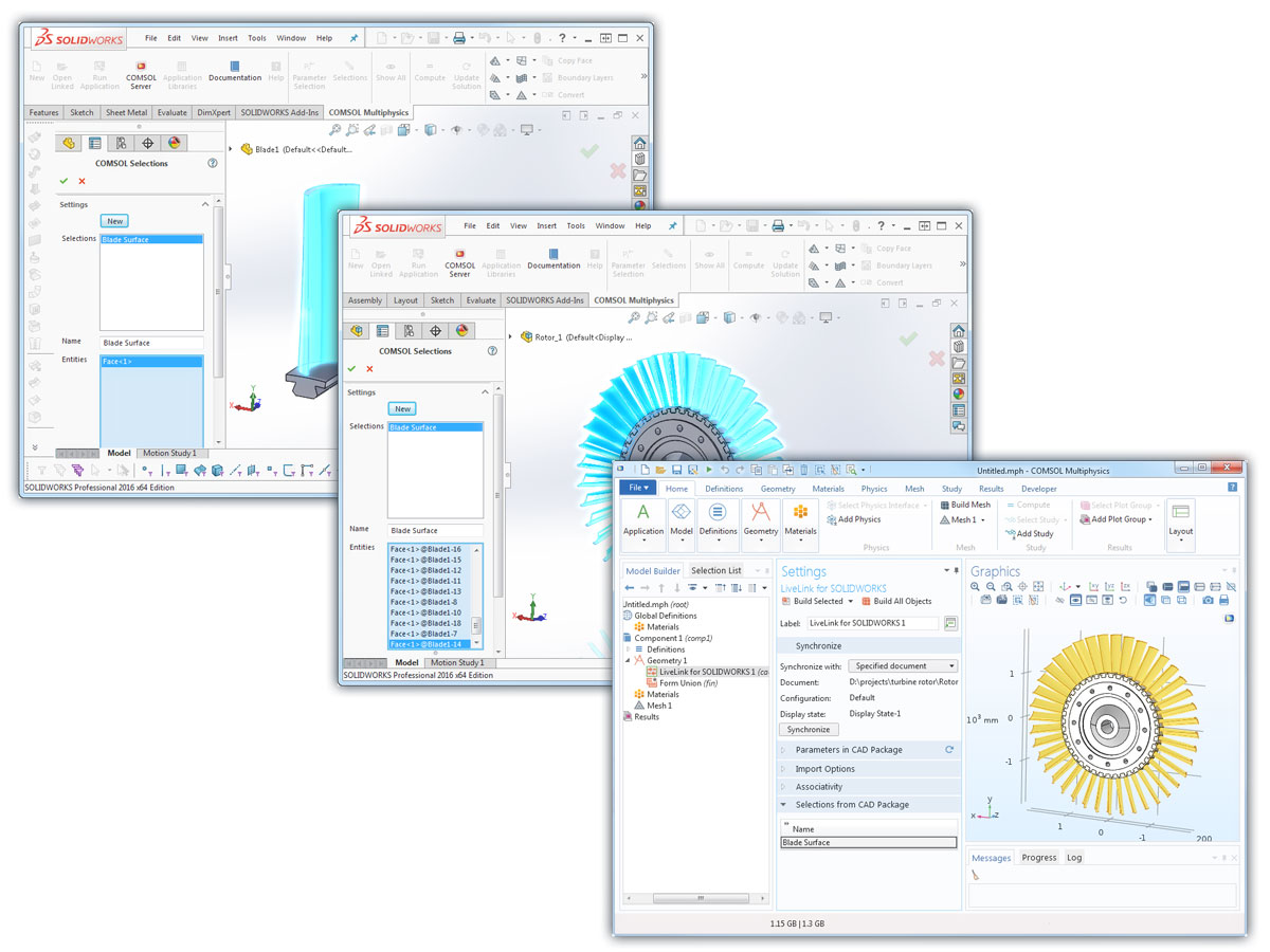 La selección de cara definida para la parte de la pala de la turbina (izquierda) se carga automáticamente para el montaje del rotor de la turbina (centro) en SOLIDWORKS®. Entonces es sincronizada directamente con el modelo de COMSOL Multiphysics® (derecha) de forma que la selección sincronizada contiene todas las instancias de la selección de cara original.