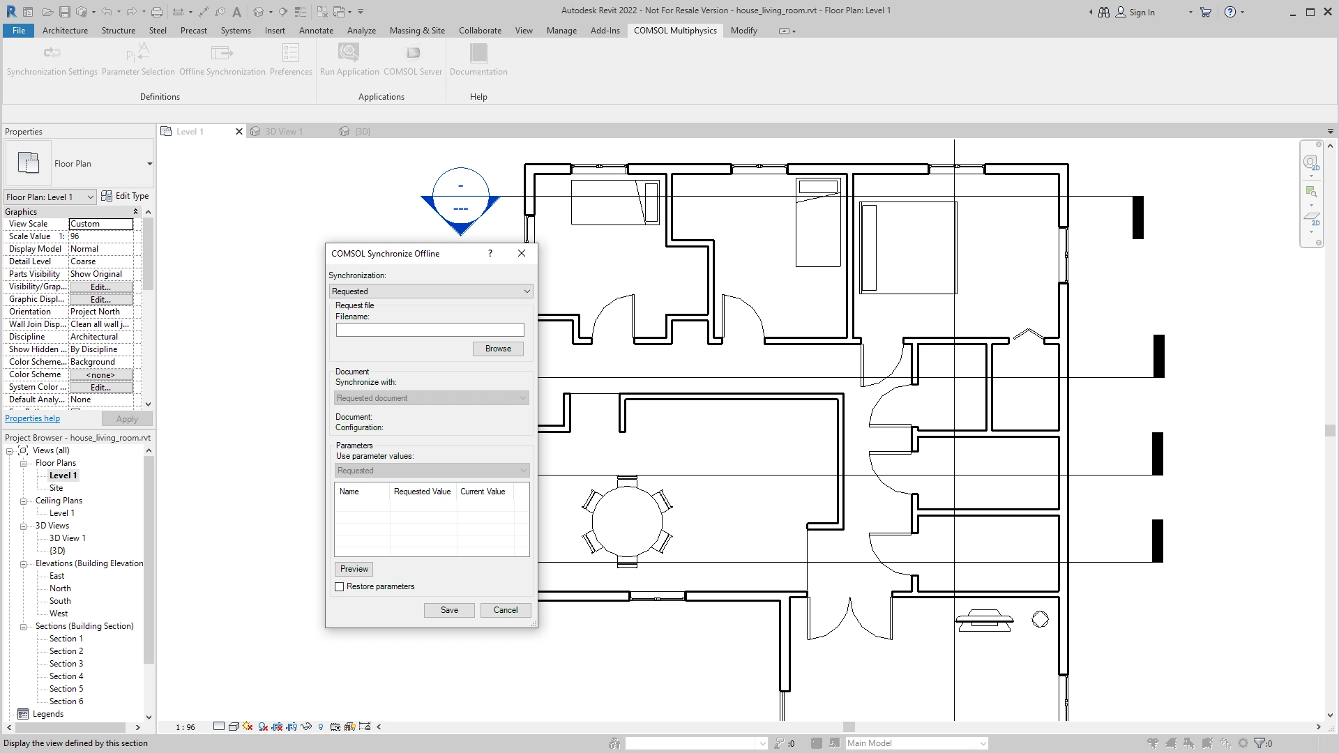 Offline synchronization ahora permite la sincronización entre COMSOL Multiphysics® y LiveLink™ for Revit® cuando están instalados en diferentes ordenadores. Esto es útil en organizaciones donde los dos diferentes paquetes son utilizados por diferentes usuarios. Utilizando el módulo LiveLink™ dentro de LiveLink™ for Revit®, puede guardarse un archivo de sincronización, que puede contener una o más versiones de una geometría. Entonces puede cargarse este archivo de sincronización con la funcionalidad LiveLink™ en un modelo de COMSOL.