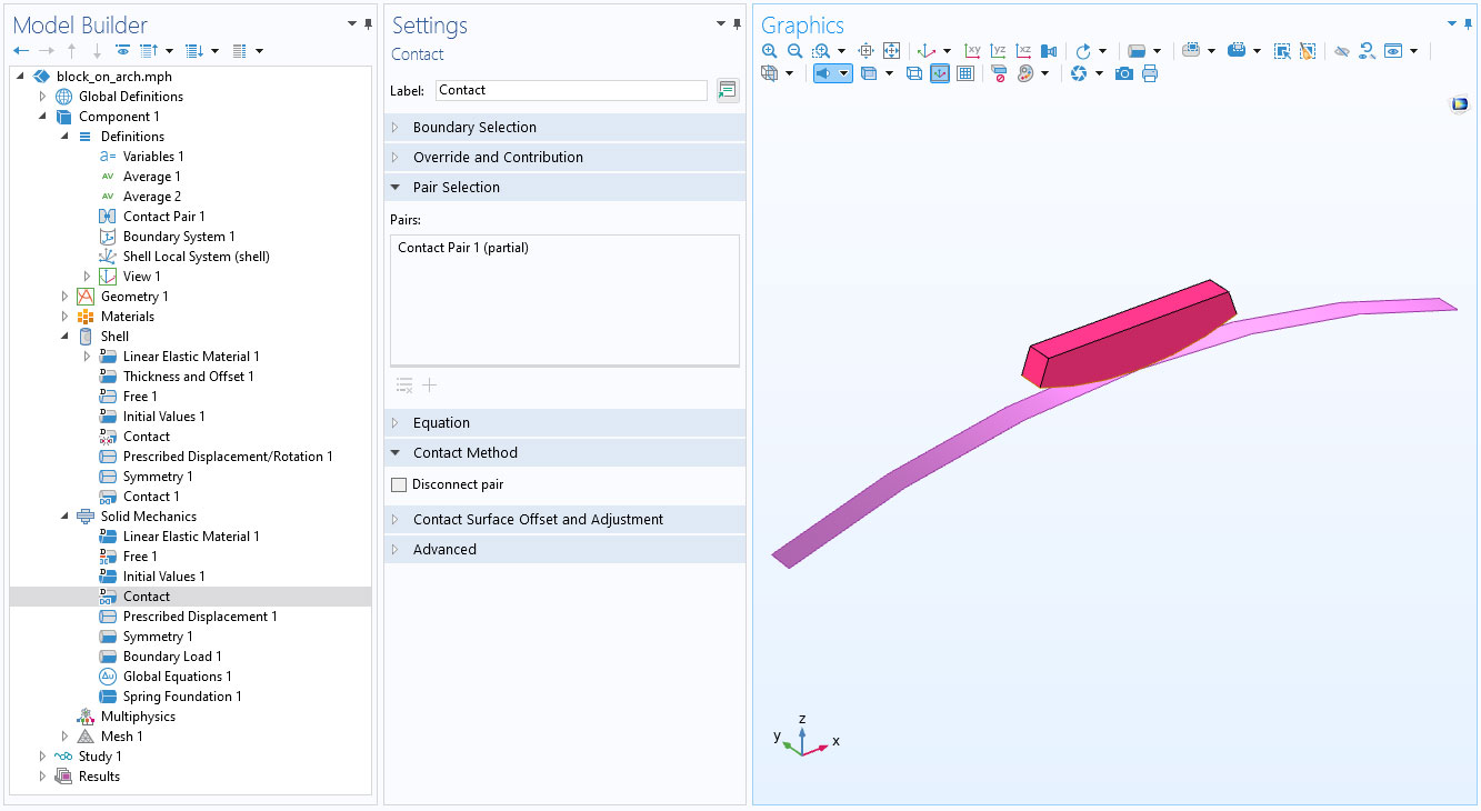 Se ha añadido una nueva función Interior Contact a la interfaz Solid Mechanics que permite incluir condiciones de contacto como fricción, adhesión y descohesión en los contornos internos. Con esta formulación, no se requieren pares de contacto ni conjuntos y el análisis puede ser geométricamente lineal. Esta función se puede utilizar para aplicaciones de modelado como uniones atornilladas y contornos separados por descohesión.