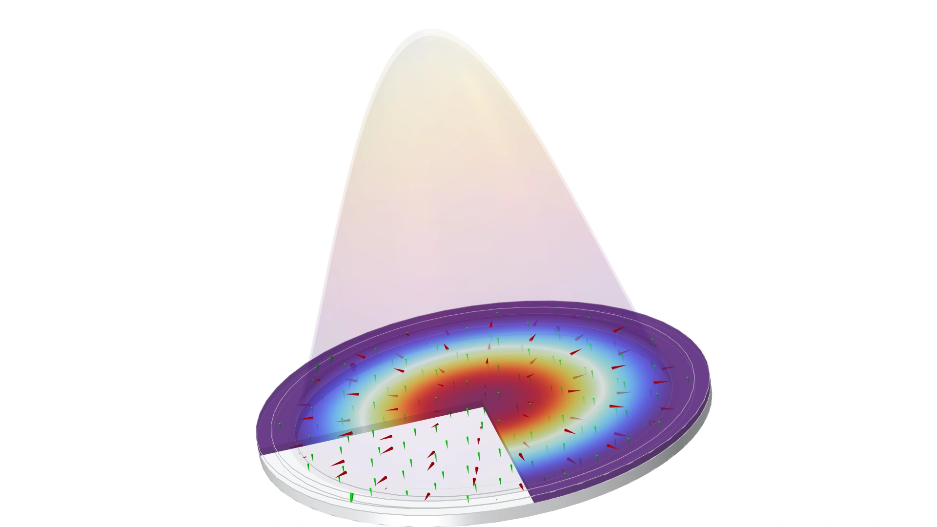 Un disco de niobato de litio (LiNbO3) en un detector piroeléctrico. La superficie sobre el disco representa la energía láser absorbida y los colores indican la distribución instantánea de la temperatura. Las flechas roja y verde representan el flujo de calor y la polarización espontánea, respectivamente.