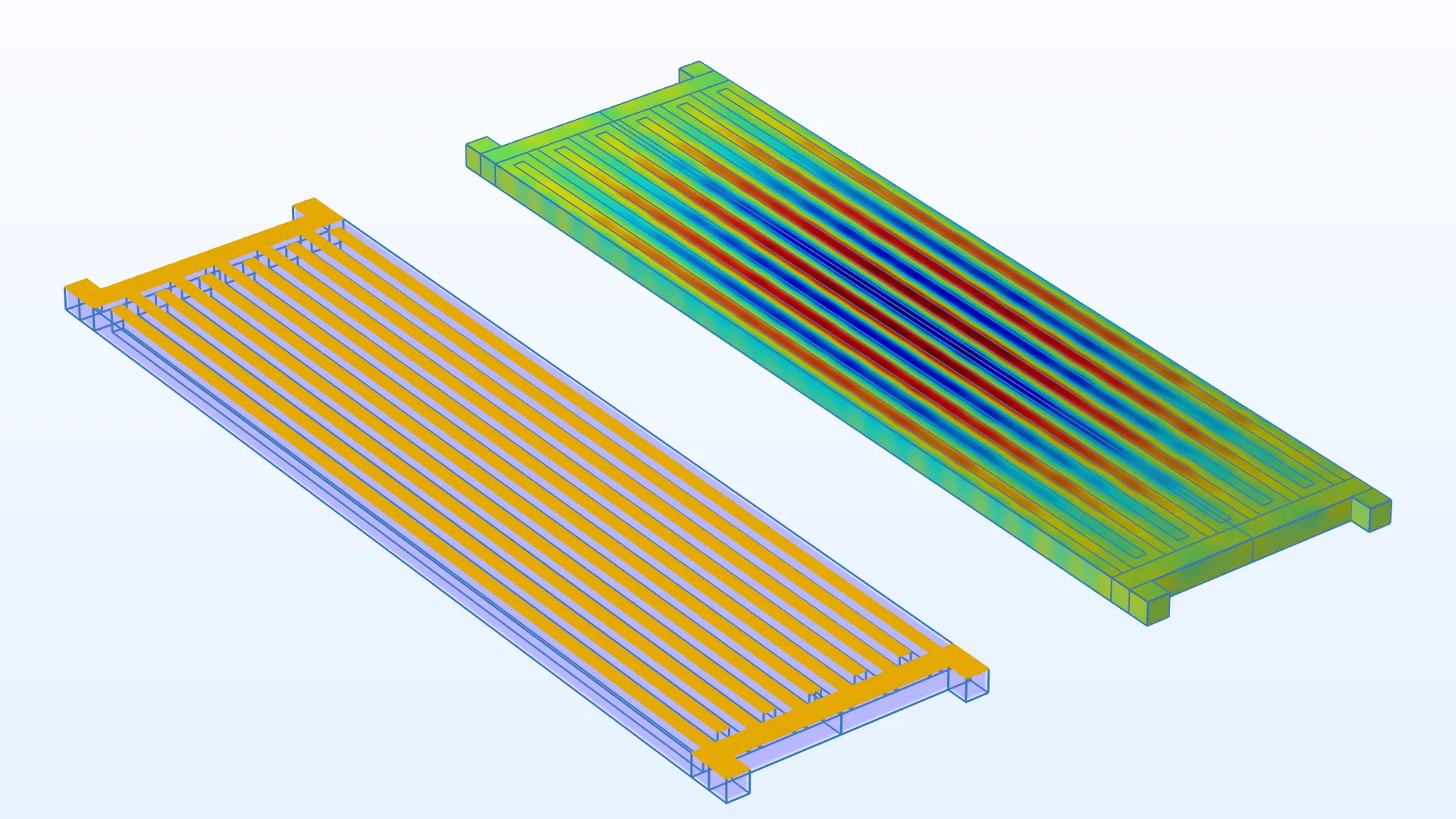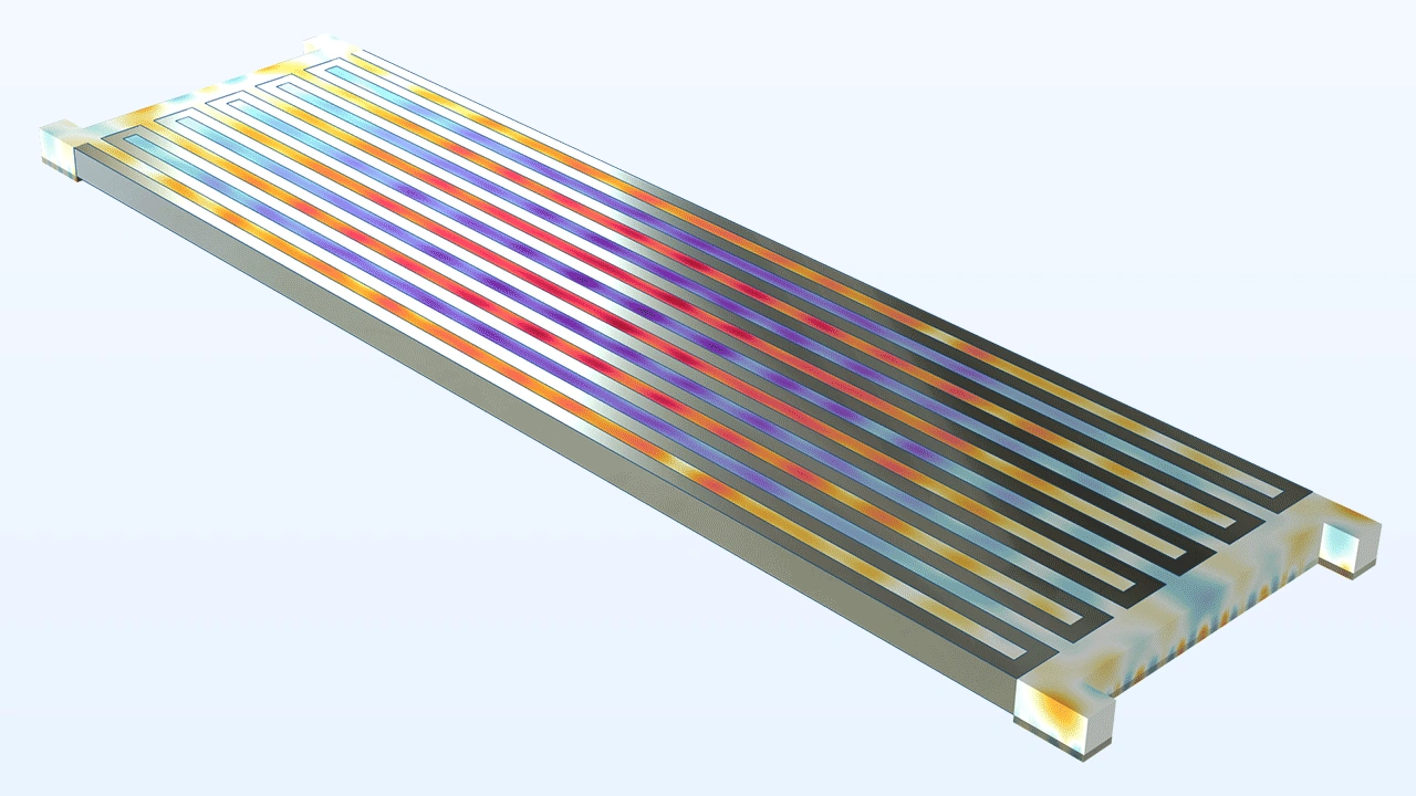 La tensión, el potencial eléctrico y la temperatura determinados en un circuito de calefacción, modelados utilizando el nuevo acoplamiento multifísico de expansión térmica y capa delgada.
