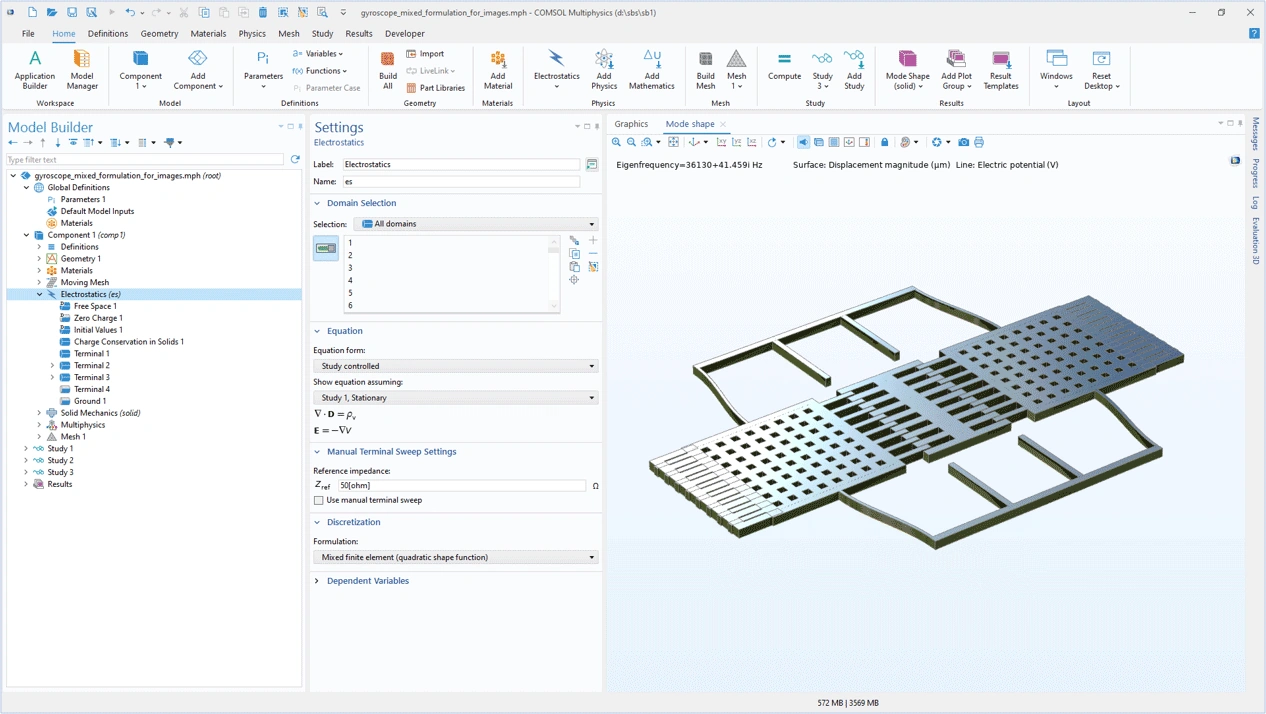 Para el análisis electrostático, una nueva formulación de ecuación ofrece cálculos de fuerza electrostática más precisos, lo que resulta particularmente útil al modelar dispositivos MEMS como acelerómetros y giróscopos. Al resolver directamente el flujo del campo de desplazamiento eléctrico, este enfoque mejora la precisión en geometrías con esquinas agudas, lo que permite evaluaciones de fuerza más prácticas. A diferencia de la formulación tradicional basada en el potencial, el nuevo método utiliza una técnica de formulación mixta, que resuelve dos ecuaciones: una para el campo de desplazamiento eléctrico (D) y otra para el potencial eléctrico (V), siendo esta última una restricción. Esta formulación D–V, designada como Mixed finite element, está disponible tanto para modelado 2D como 3D y es la opción de discretización predeterminada para la interfaz Electrostatics que se utiliza con la interfaz multifísica Electromechanics.