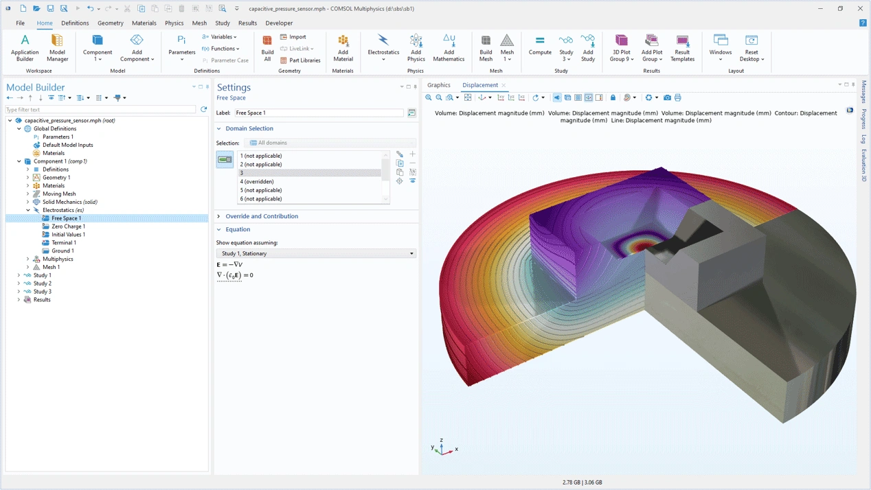 Un modelo de sensor de presión capacitivo que muestra el desplazamiento de una membrana con un dominio Free Space debajo.
