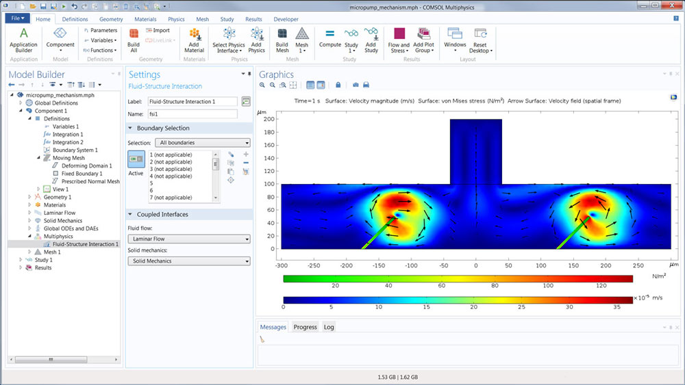 Las microbombas son dispositivos clave en los sistemas microfluídicos, con aplicaciones que van desde la manipulación de fluidos biológicos a enfriamiento microelectrónico. Este tutorial simula el mecanismo de una microbomba sin válvula que se ha diseñado para ser efectividad a bajos números de Reynolds, y así superando la reversibilidad hidrodinámica. Las bombas sin válvula a menudo se prefieren en sistemas microfluídicos porque minimizan el riesgo de obstrucción y son compatibles con el material biológico. La interfaz de interacción fluido-estructura se utiliza para resolver el flujo de fluido y la deformación asociada de la estructura. Adicionalmente, la interfaz de Global ODEs and DAEs se utiliza para demostrar cómo realizar una integración en el tiempo del flujo total a través del ciclo de bombeo.