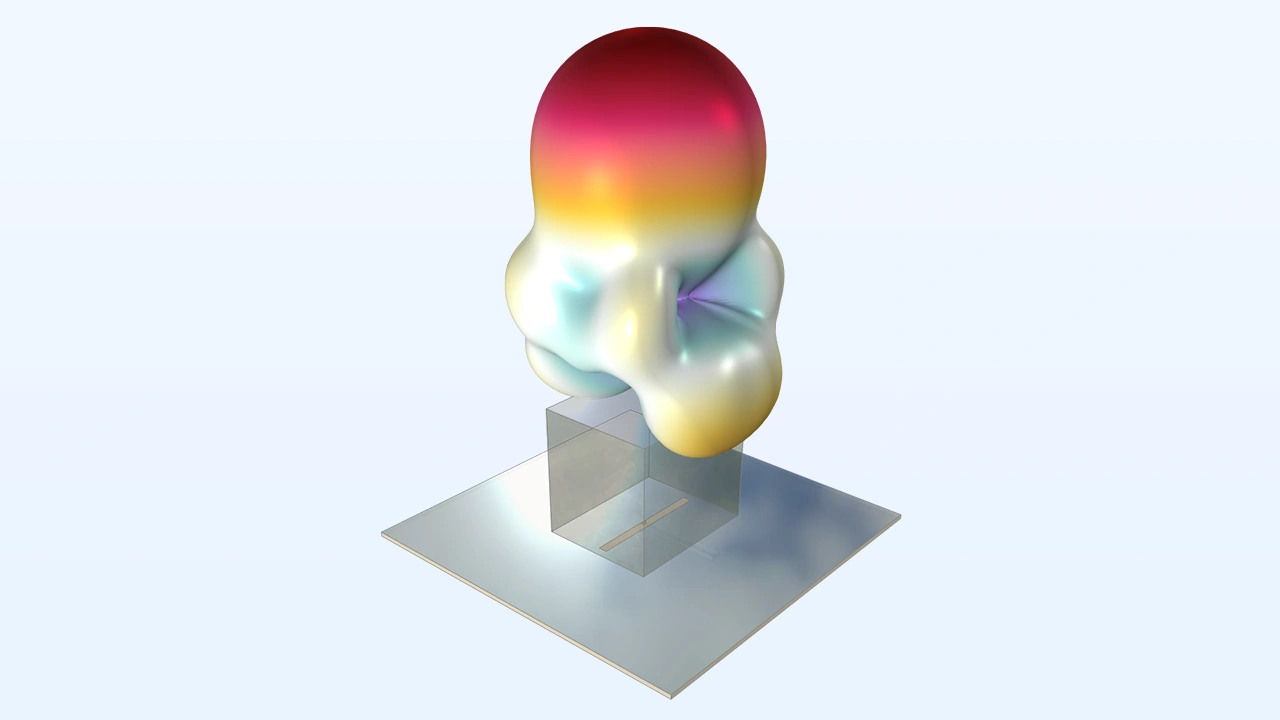 La radiación de campo lejano en presencia de un sustrato también puede analizarse mediante la nueva función Far-Field Domain, Inhomogeneous. Esta nueva función permite el cálculo de campo lejano para estructuras compuestas por un superestrato (aire) y un sustrato dieléctrico homogéneo, como se muestra en el modelo tutorial Embedded Scatterer on a Substrate.