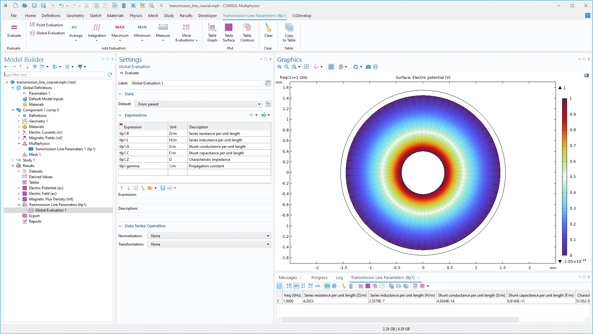 Se modeló un cable coaxial utilizando la interfaz de Parámetros de Línea de Transmisión. El modelo extrae los parámetros de la línea de transmisión y calcula el potencial eléctrico, el campo eléctrico y la densidad de flujo magnético.