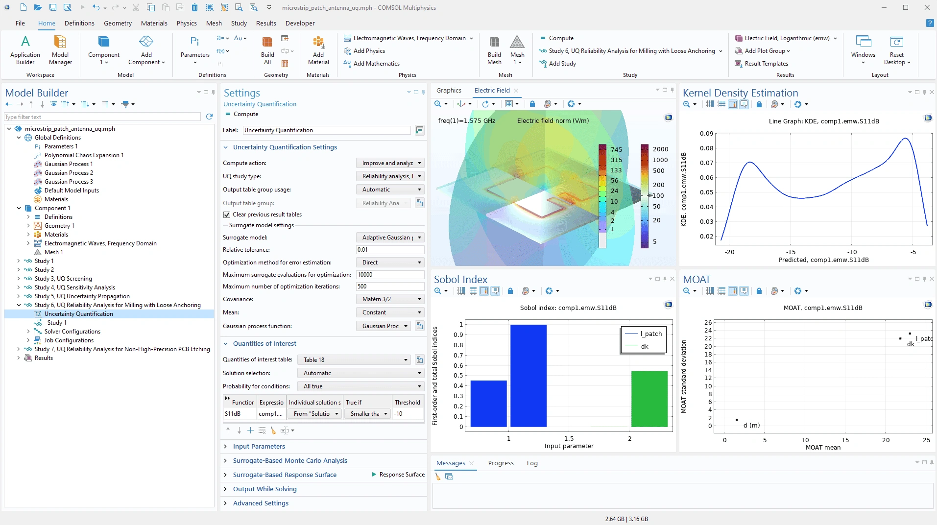 La biblioteca de aplicaciones del módulo RF se ha ampliado para introducir la cuantificación de la incertidumbre en los dispositivos de microondas, examinando cómo las variaciones en los parámetros de entrada, como las propiedades del material o las variaciones geométricas, afectan el rendimiento del dispositivo en términos del parámetro S. El análisis incluye un estudio de selección para identificar qué parámetros influyen de forma más significativa en las métricas de rendimiento clave. También evalúa los efectos relativos de estos parámetros y sus interacciones en el análisis de sensibilidad. El análisis de fiabilidad evalúa la solidez del diseño final con respecto a las variaciones en los parámetros de diseño al determinar la probabilidad de alcanzar los criterios de rendimiento especificados. Los modelos del tutorial Bow-Tie Antenna Optimization y Uncertainty Quantification Study for a Microstrip Patch Antenna muestran esta nueva funcionalidad.