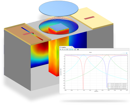 Dos potentes métodos de simulación se han implementado en los ejemplos existentes de la librería de aplicaciones para el diseño de dispositivos del tipo filtro paso banda de alto Q: la evaluación de la forma de onda asintótica y el método modal en el dominio de la frecuencia. Ambos realizan las simulaciones a velocidades que son varios órdenes de magnitud más rápidos que el barrido de frecuencia convencional para estos dispositivos.