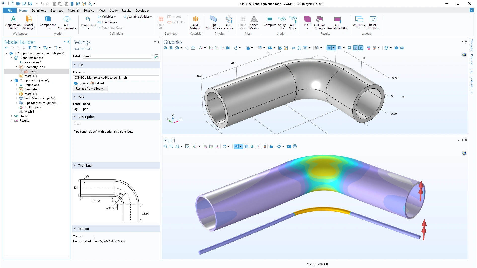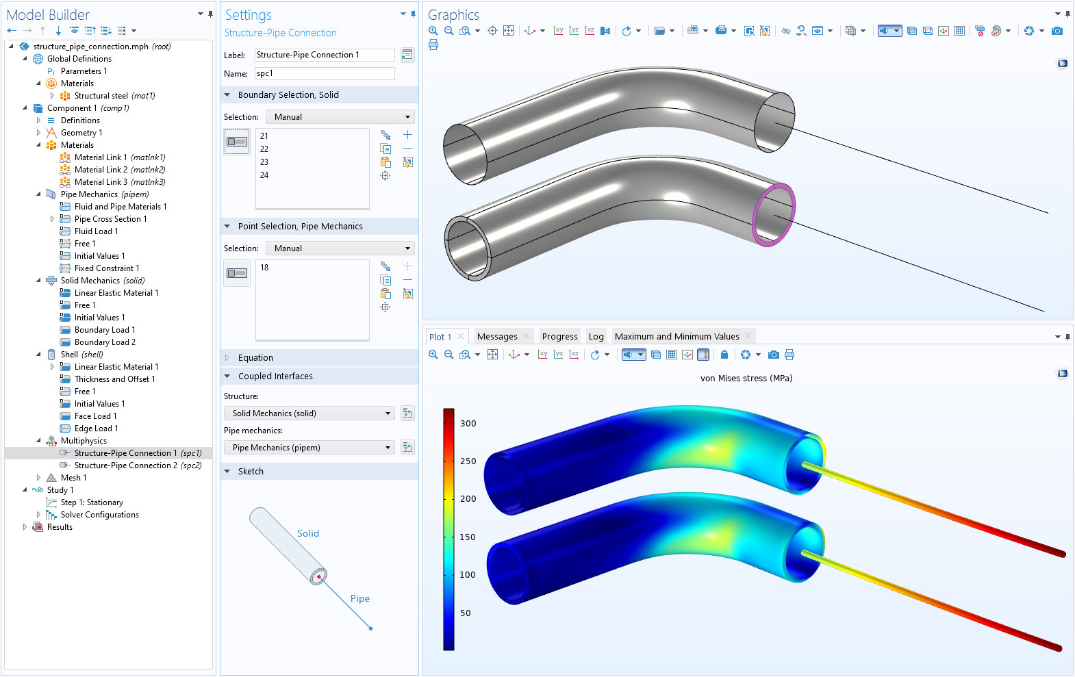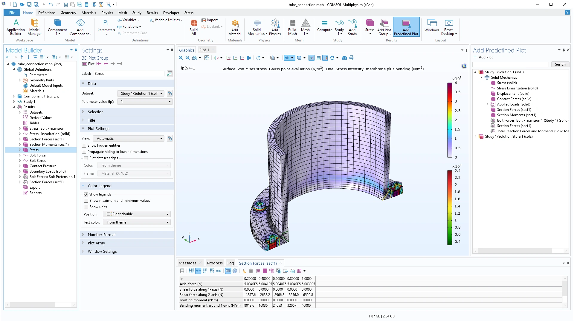 En la app, se puede modificar la geometría de las tuberías, el tamaño de la región de solapamiento y el coeficiente de fricción. Después de hacer esto, la app muestra la tensión efectiva en el montaje, la presión de contacto en la interfaz entre las dos tubería, y la deformación de las dos tuberías en el diámetro de interferencia.