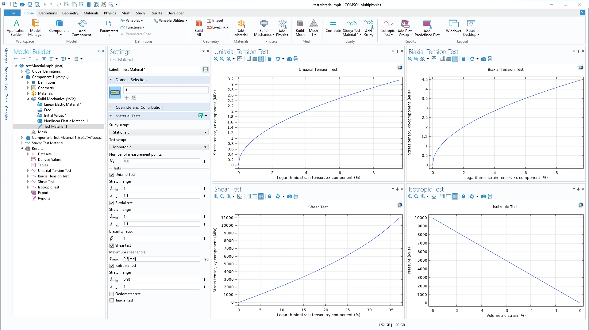 En las anteriores aplicaciones, el usuario puede proporcionar las propiedades materiales o seleccionarlas del archivo material del módulo de mecánica estructural, Structural Mechanics. Las propiedades materiales pueden darse como funciones arbitrarias de espacio, tiempo, desplazamientos, tensión y presión. Las aplicaciones anteriores pueden combinarse con las prestaciones de análisis siguientes:
