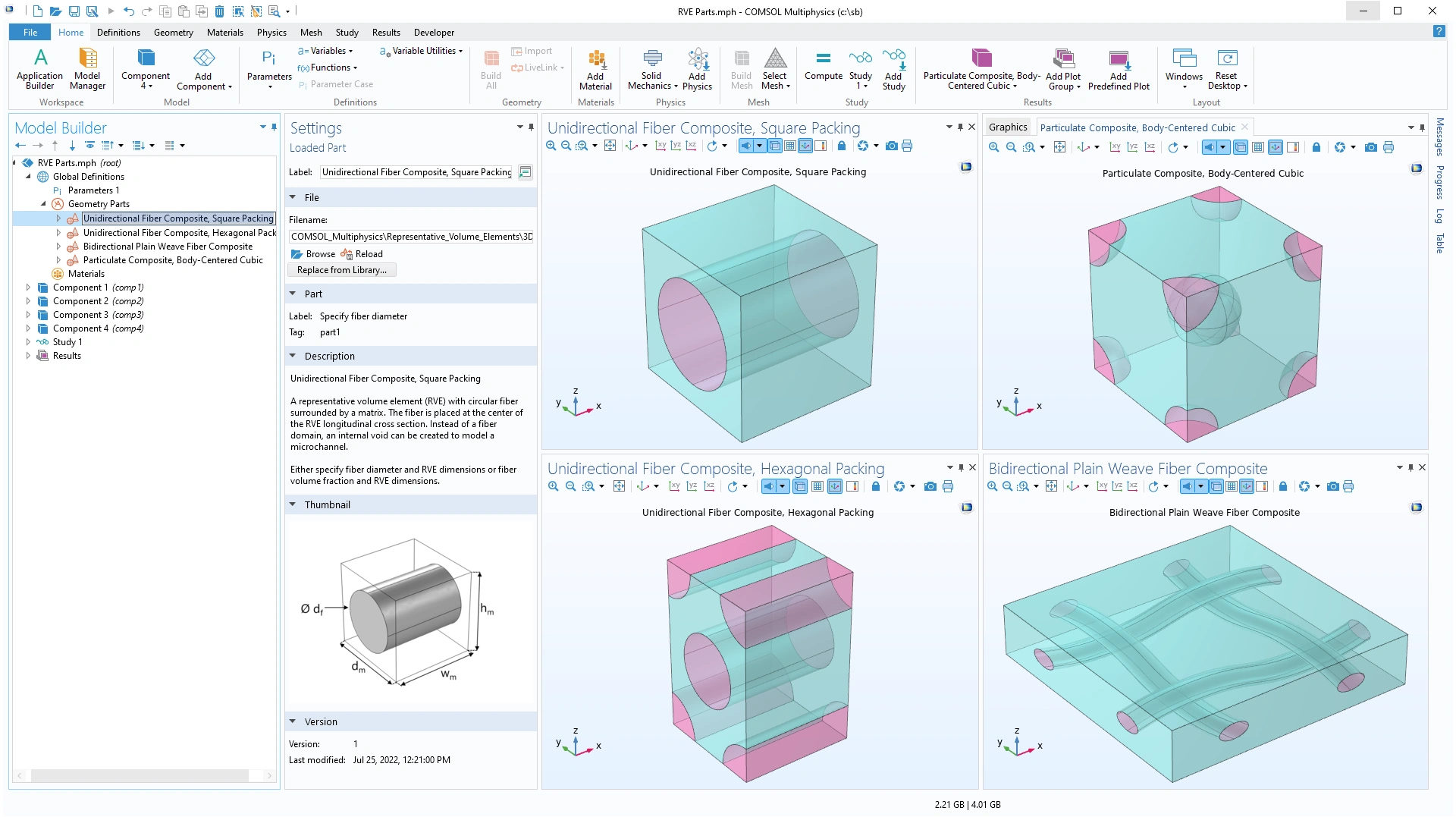 Se ha añadido un nuevo complemento para generar piezas geométricas para compuestos de partículas aleatorias en la rama de COMSOL Multiphysics de las bibliotecas de complementos Add-in Libraries. El complemento se puede utilizar para crear partículas esféricas dentro de un bloque rectangular, donde sus posiciones y tamaños son fijos o se distribuyen aleatoriamente en función de diferentes distribuciones de probabilidad.