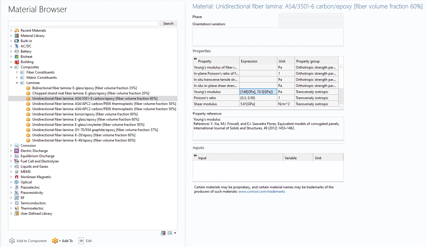 La nueva carpeta integrada para materiales compuestos se divide en tres grupos de materiales: componentes de fibra, componentes de matriz y láminas. Esta función facilita la configuración de modelos con tipos comunes de capas de materiales compuestos.