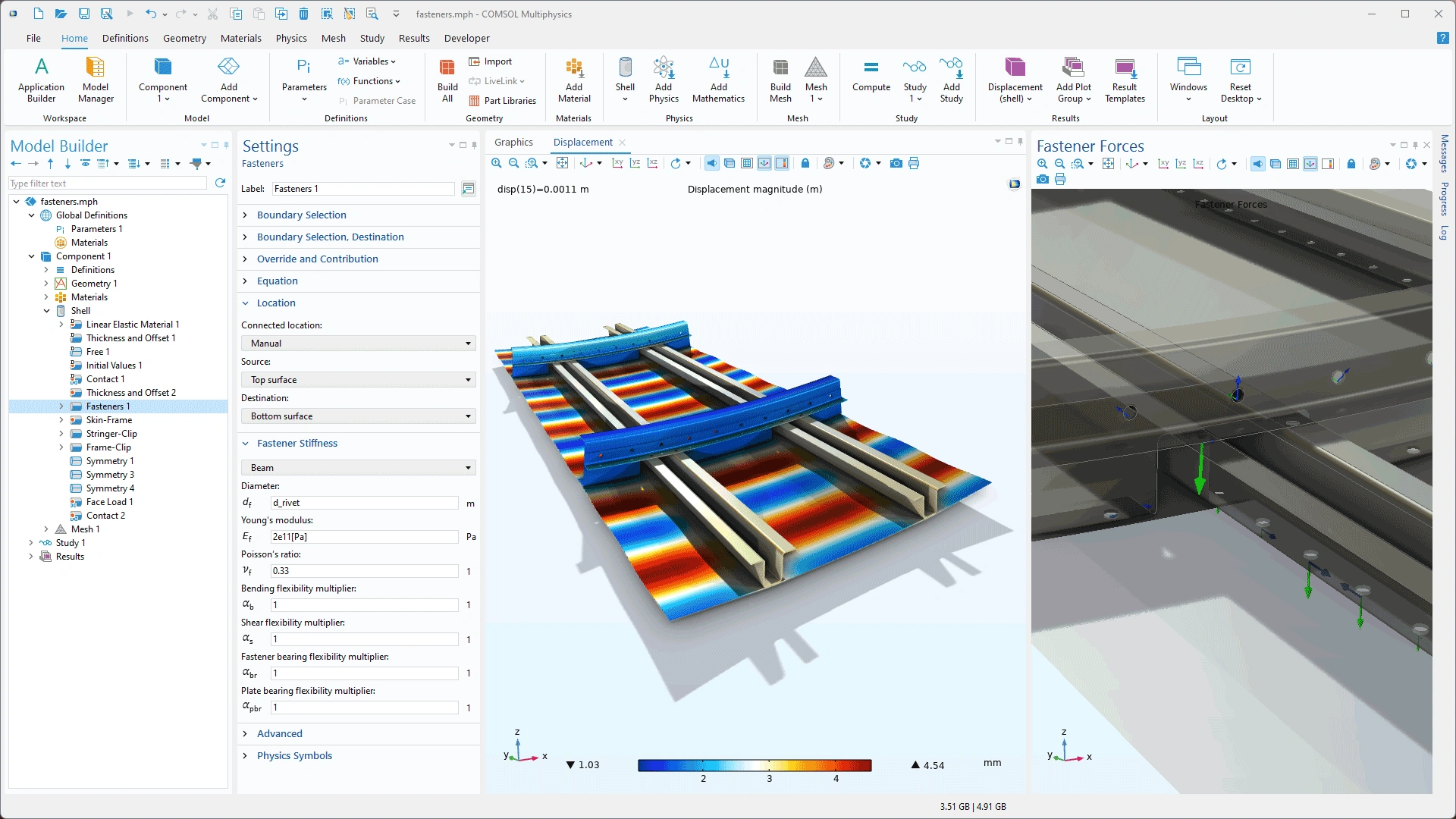 En el caso de estructuras conectadas por una gran cantidad de elementos de sujeción, como remaches o pernos, el modelado manual de cada elemento puede consumir mucho tiempo. Para ayudar a aliviar este problema, se ha añadido una nueva funcionalidad de fijadores Fasteners a la interfaz de Shell. Esta función detecta automáticamente orificios circulares emparejados en contornos de carcasa paralelos y los conecta. La rigidez de la conexión tendrá en cuenta propiedades como los datos del material, el diámetro del sujetador y el espesor de la placa. También es posible calcular factores de seguridad para los fijadores en función de expresiones definidas por el usuario. El nuevo modelo tutorial Postbuckling Analysis of an Aircraft Fuselage muestra esta función.