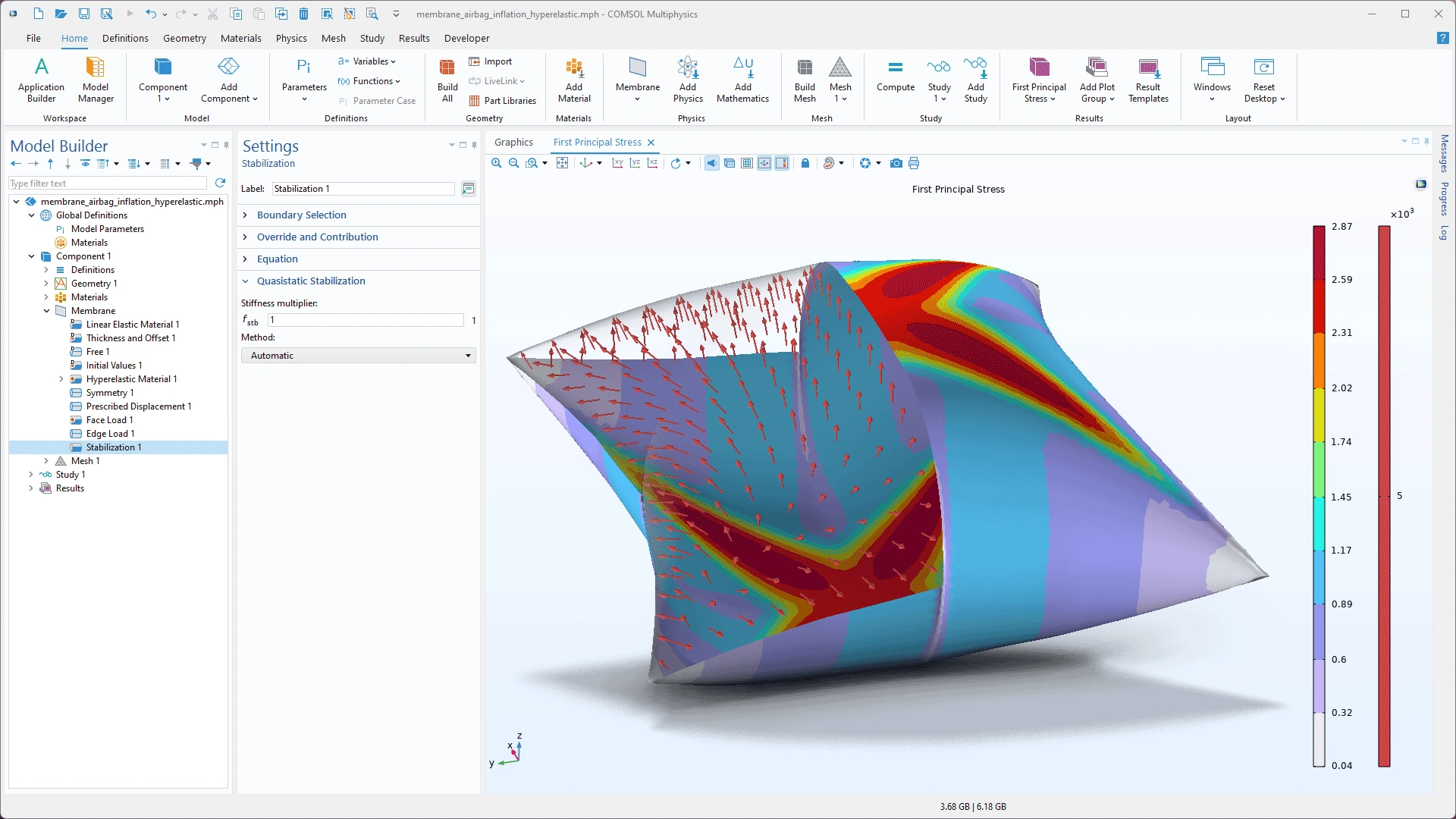 La configuración del nuevo nodo Stabilization con una estructura de membrana inflada en la ventana Graphics.