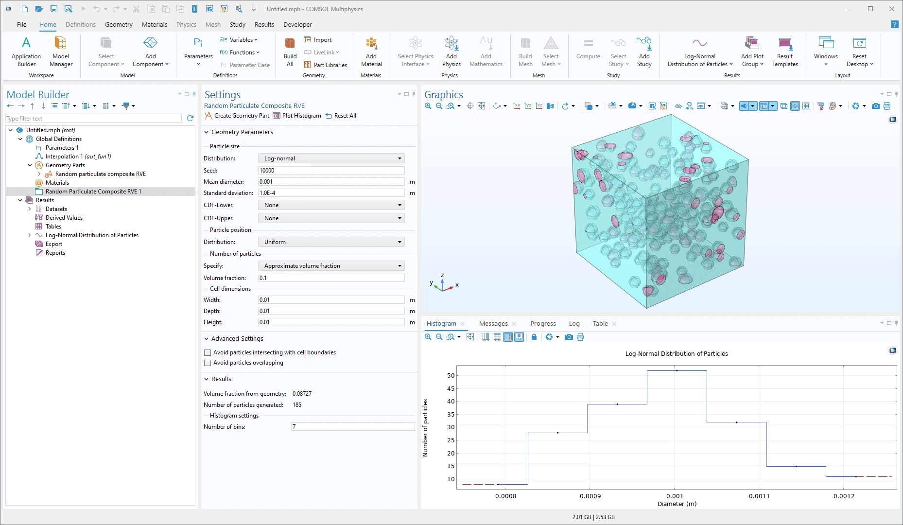 El complemento Random Particulate Composite RVE que se muestra en el Model Builder, la parte de geometría creada y un gráfico de histograma.