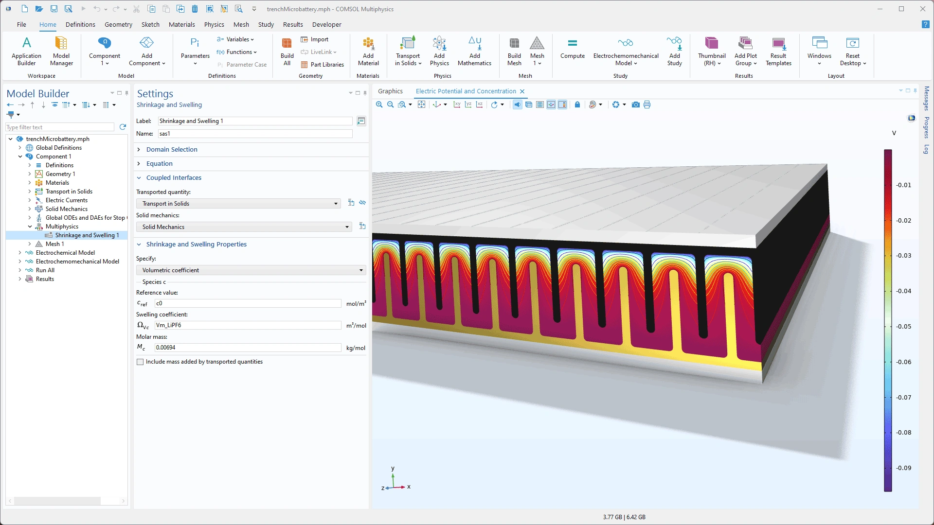 Para modelar los cambios de volumen inducidos por la difusión, se ha añadido un nuevo acoplamiento multifísico Shrinkage and Swelling que conecta de forma bidireccional las interfaces Transport in Solids y Solid Mechanics. Este nuevo acoplamiento se puede utilizar para simular los efectos de los cambios de concentración en el volumen y cómo las tensiones pueden afectar a la difusión. Esto resulta útil, por ejemplo, en baterías, donde pueden producirse cambios de volumen muy grandes debido al transporte de iones.