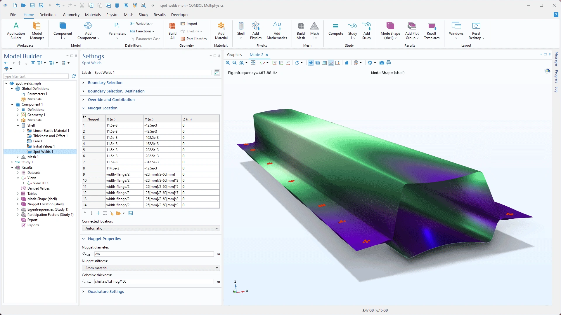 La ventana Settings para el nodo Spot Welds y un modo propio para un perfil de viga soldado por puntos.