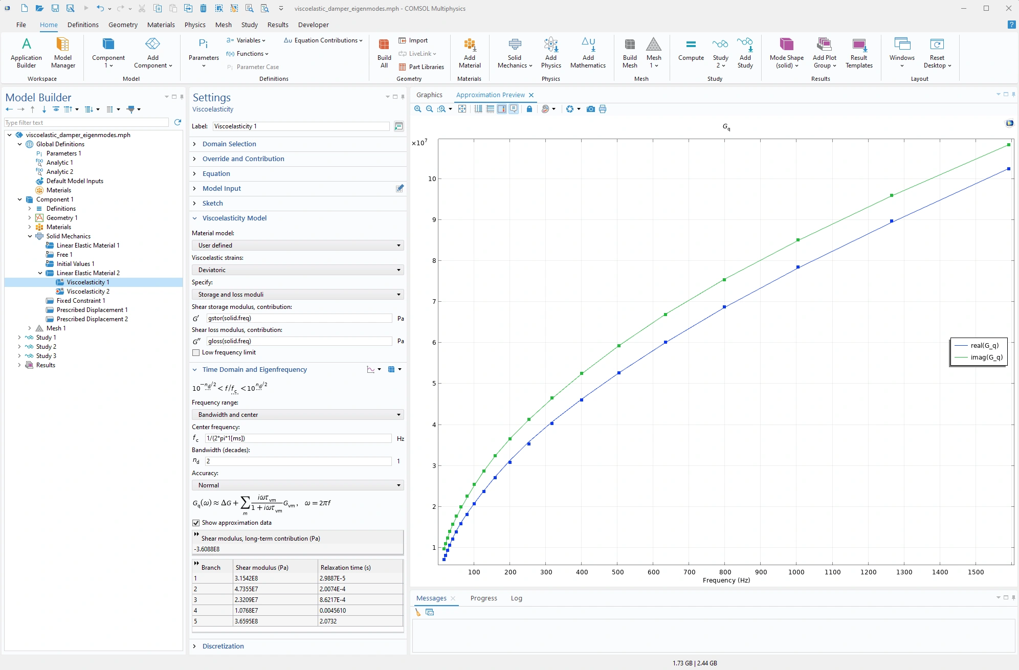 Las propiedades de los materiales viscoelásticos suelen medirse en el dominio de la frecuencia y suelen estar disponibles como módulos de almacenamiento y pérdida dependientes de la frecuencia o se aproximan mediante modelos de derivadas fraccionarias. En esta versión, se ha añadido una nueva capacidad a la función de viscoelasticidad que asigna dichos datos a funciones del dominio del tiempo mediante un ajuste de fracción parcial. Esto permite a los usuarios realizar simulaciones dependientes del tiempo de materiales viscoelásticos, independientemente de la forma original de las propiedades del material. Esta nueva incorporación se puede ver en el modelo tutorial Eigenmodes of a Viscoelastic Structural Damper.