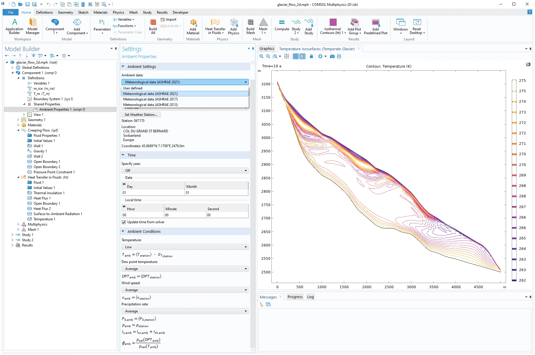 Pueden definirse propiedades ambientales, como temperatura, humedad, precipitación y radiación solar, desde un nodo Ambient properties bajo Definitions > Shared Properties. Junto con la posibilidad de añadir datos metereológicos definidos por el usuario, las variables ambientales pueden calcularse desde medidas promediadas mensual y horariamente desde valores en manuales proporcionados por la American Society of Heating, Refrigerating, and Air-Conditioning Engineers (ASHRAE). Los datos meteorológicos del manual ASHRAE han sido integrados en COMSOL Multiphysics® y contiene datos ambientales desde más de 8500 estaciones meteorológicas de todo el mundo. Puede verse esta adición en el modelo tutorial existente "Glacier Flow".