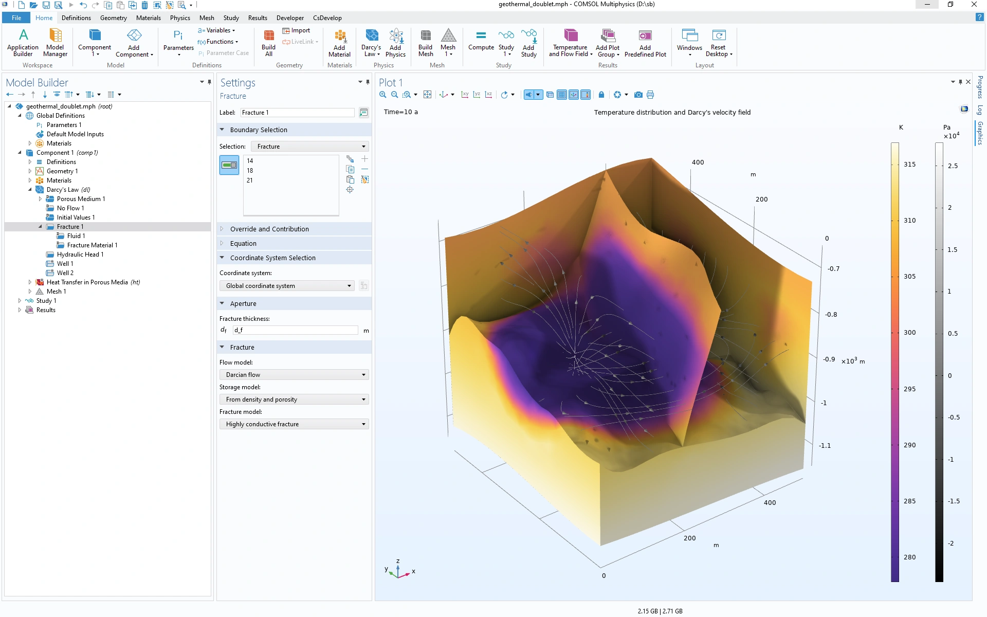 El gráfico de superficie de segundo plano muestra la coordenada z (leyenda derecha), la superficie de fractura muestra la temperatura (leyenda izquierda), y las líneas de corriente muestran el campo de velocidad de Darcy (sin leyenda) en el doblete geotérmico.