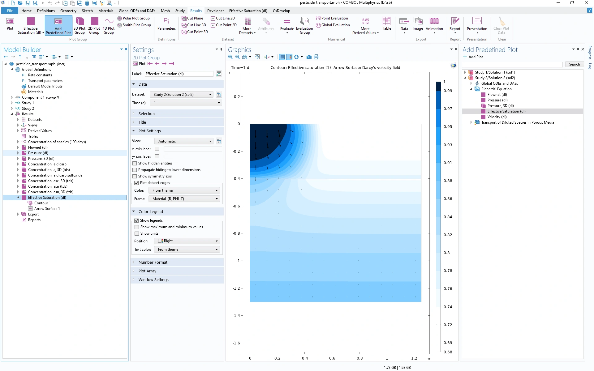 Nuevo gráfico Flownet La interfaz de la Ecuación de Richards en geometrías 2D y 2D con simetría axial ahora genera un grupo de gráfico Flownet 2D por defecto. Este gráfico combina un gráfico de líneas de flujo para el campo de velocidad de Darcy y un gráfico de niveles para la variable de cabeza de presión.