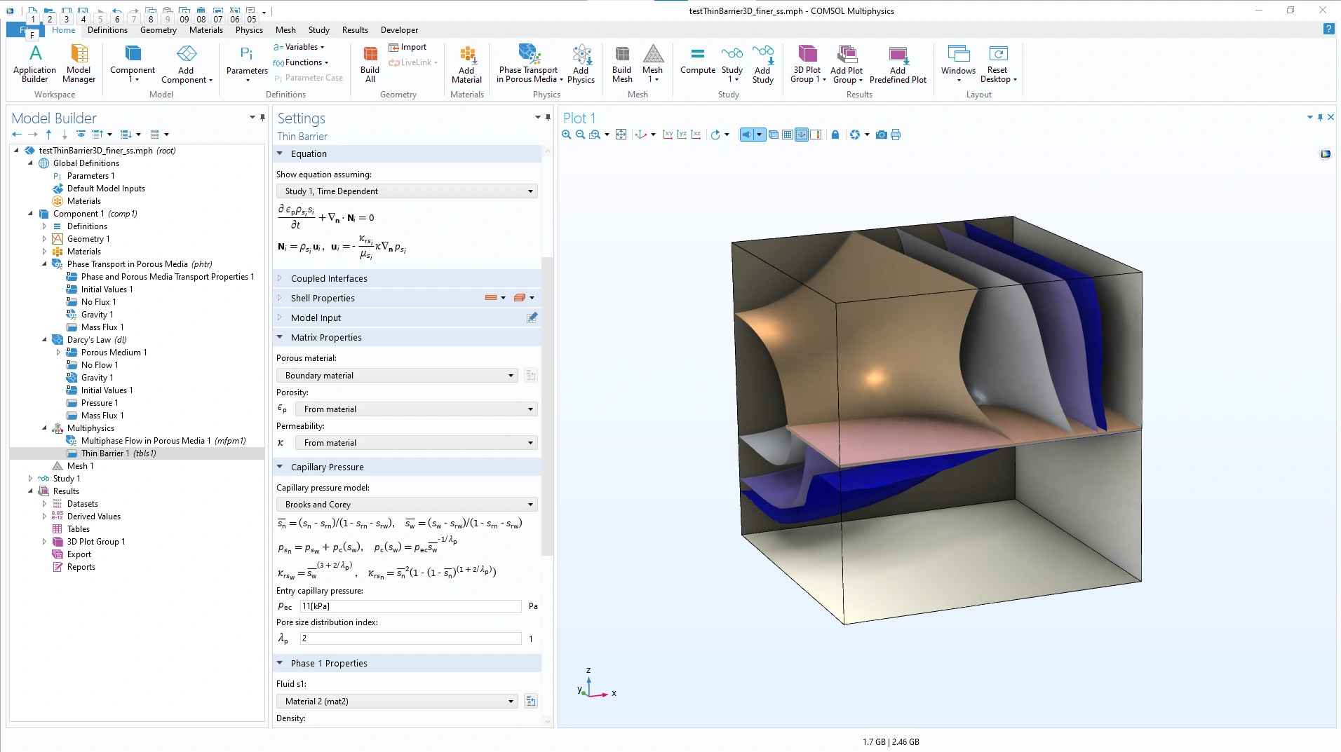 En las interfaces de Ley de Darcy y Ecuaciones de Richards ahora se pueden definir paredes permeables en contornos interiores con la condición de contorno Thin barrier. Estas condiciones de contorno típicamente se utilizan para representar estructuras delgadas poco permeables. Con la condición de contorno Thin barrier se evita mallar estructuras delgadas como geotextiles o placas perforadas, reduciendo los costes de tiempo y recursos computacionales.