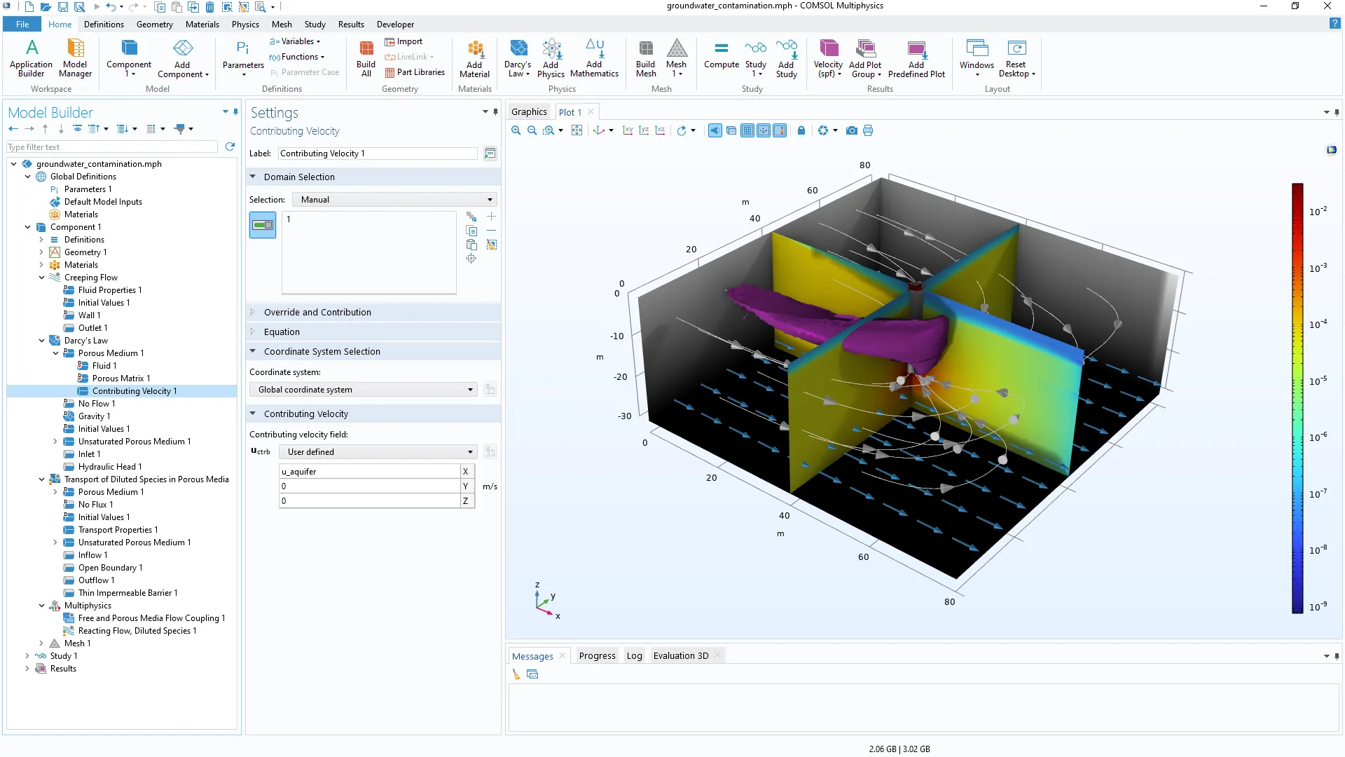 La funcionalidad de medio poroso parcialmente saturado en la interfaz de transporte de especie diluido permite el modelado de convección, difusión, adsorción, dispersión y volatilización en dominios porosos parcialmente saturados. Además, una nueva funcionalidad de propiedades de transporte en medios porosos en la interfaz de transporte de especies diluidos proporciona acceso a la misma funcionalidad. También incluye la funcionalidad de Fuente de Especie, que tiene en cuenta las fuentes (o sumideros) de especies químicas en dominios porosos.