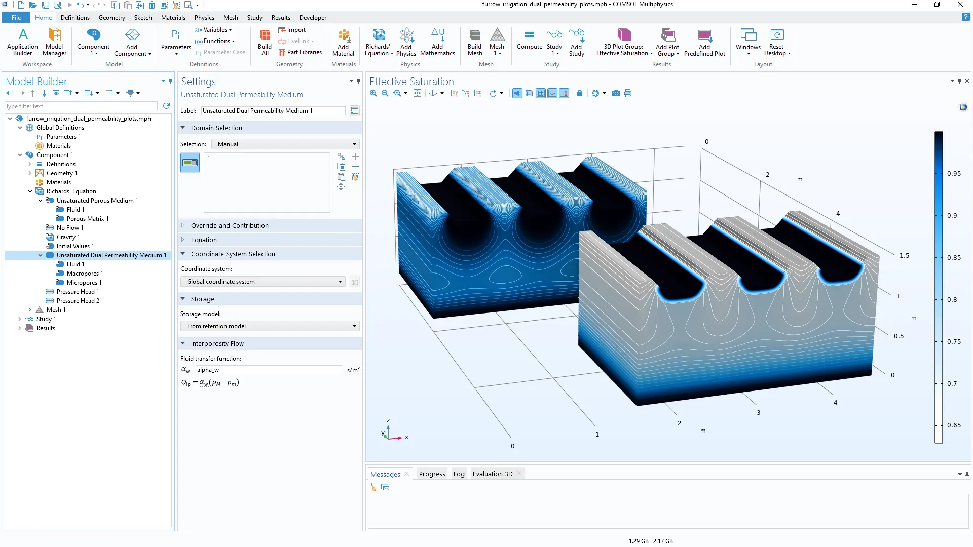 Hay dos nuevas características Dual Permeability Medium y Unsaturated Dual Permeability Medium dentro de las interfaces Darcy's Law y Richards' Equation. Estas características permiten modelar el flujo de fluido saturado o insaturado dentro de un enfoque de permeabilidad dual, donde están presentes dos sistemas porosos distintos e interconectados. El enfoque de permeabilidad dual se puede aplicar a casos en los que ambos sistemas porosos están completamente saturados y tienen permeabilidades variables. Pueden verse estas nuevas funciones en el nuevo modelo tutorial Furrow Irrigation - Dual Permeability.