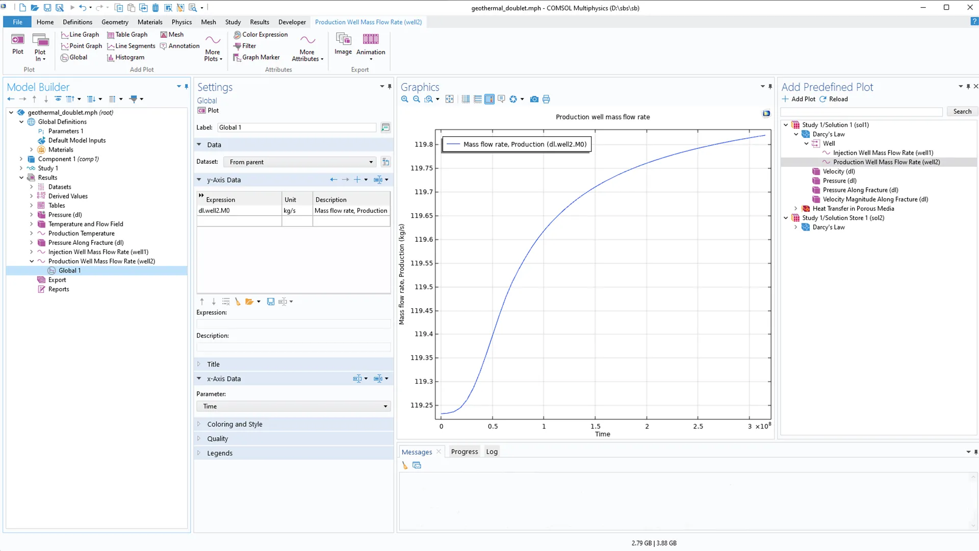 Gráfico predefinido para el caudal másico del pozo, que se muestra en el modelo tutorial Geothermal Doublet.